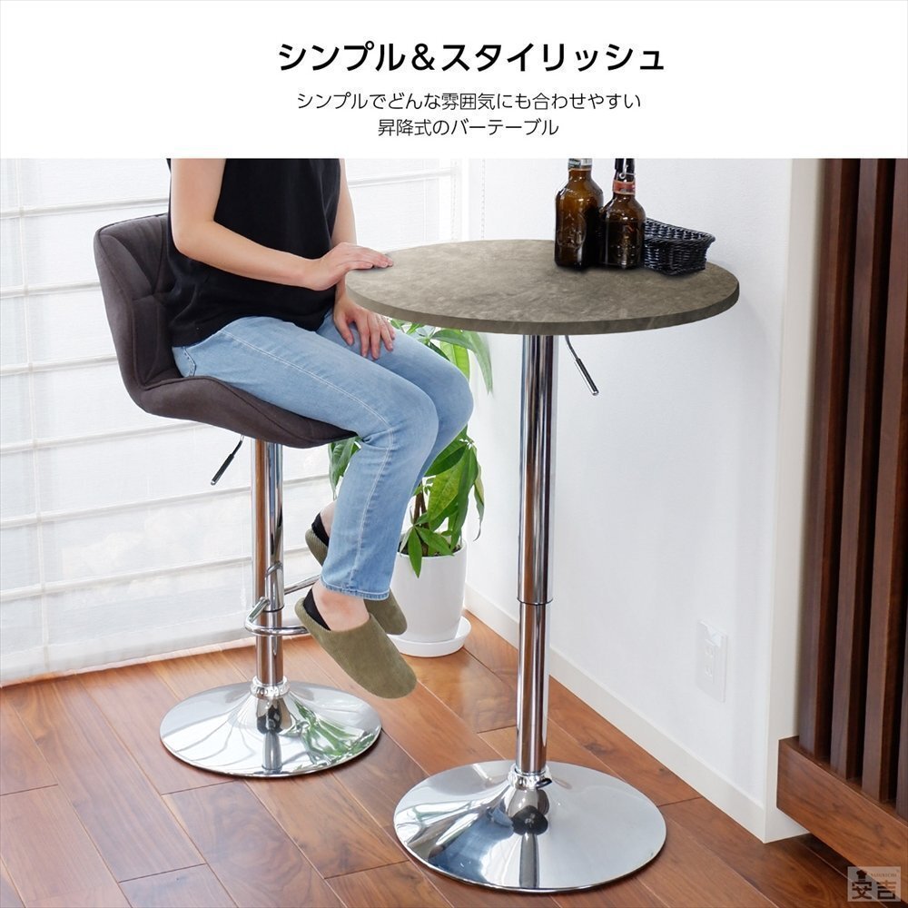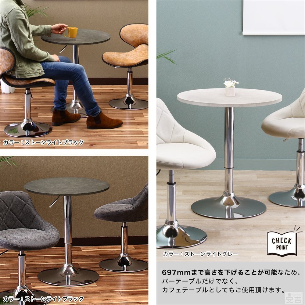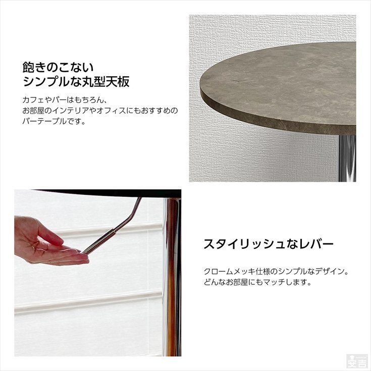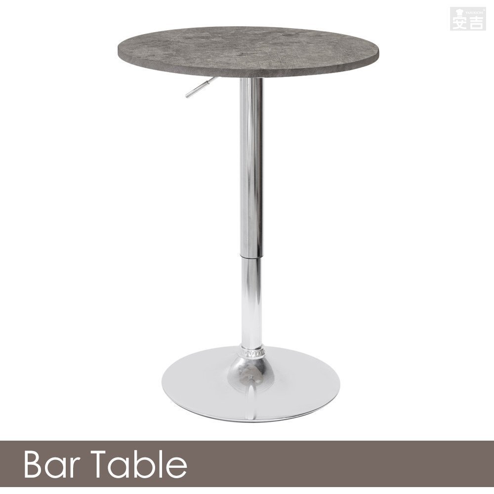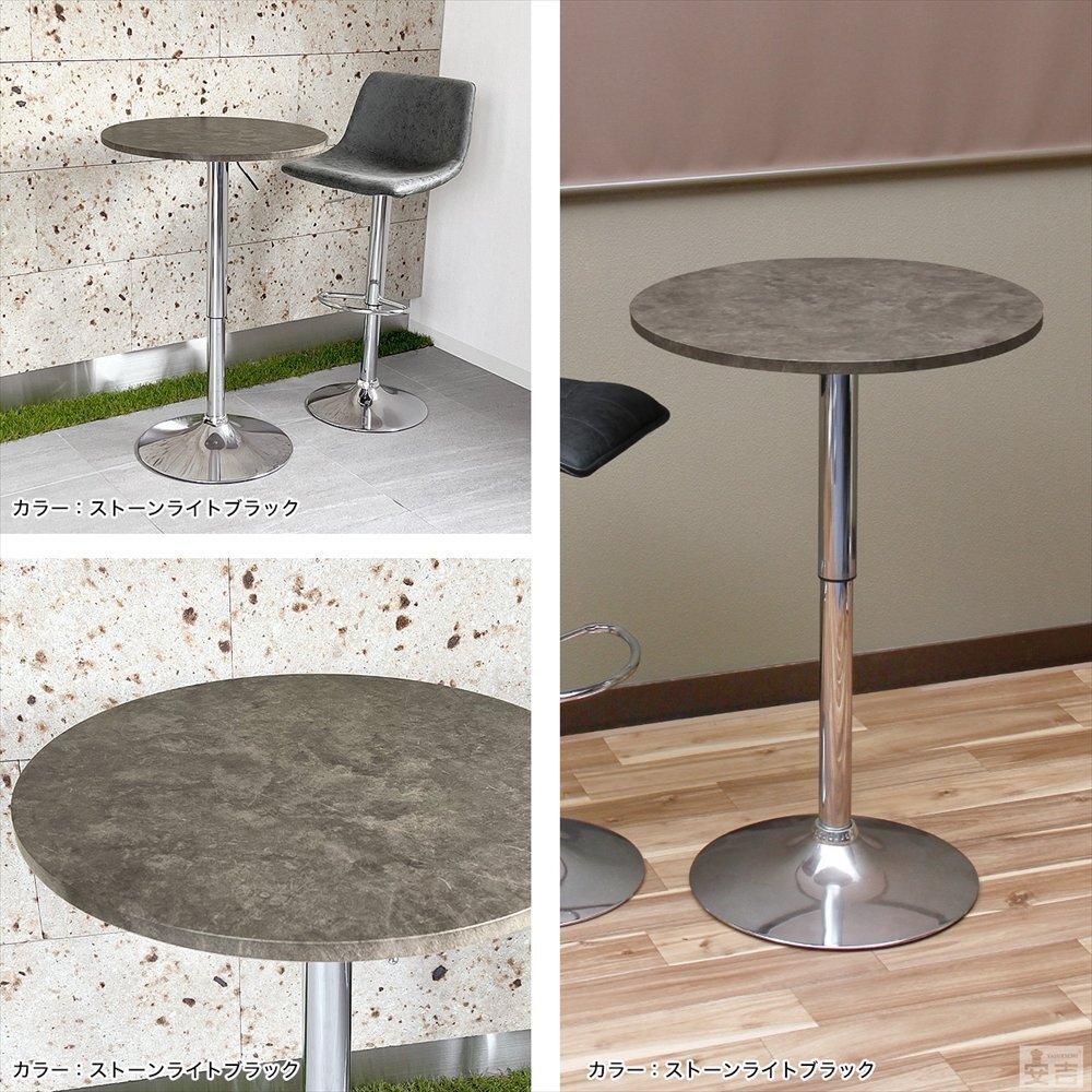 カラー | ストーンライトブラック | 特長 | ・テーブルは360度回転します。 ※天板の固定は出来ません。 ・テーブル下のレバーで高さを調整できます。 ・バーやカフェのテーブル、休憩室や喫煙室のテーブルにも最適です。 ・昇降式なので座ってでも立ってでも利用できるテーブルです。 |