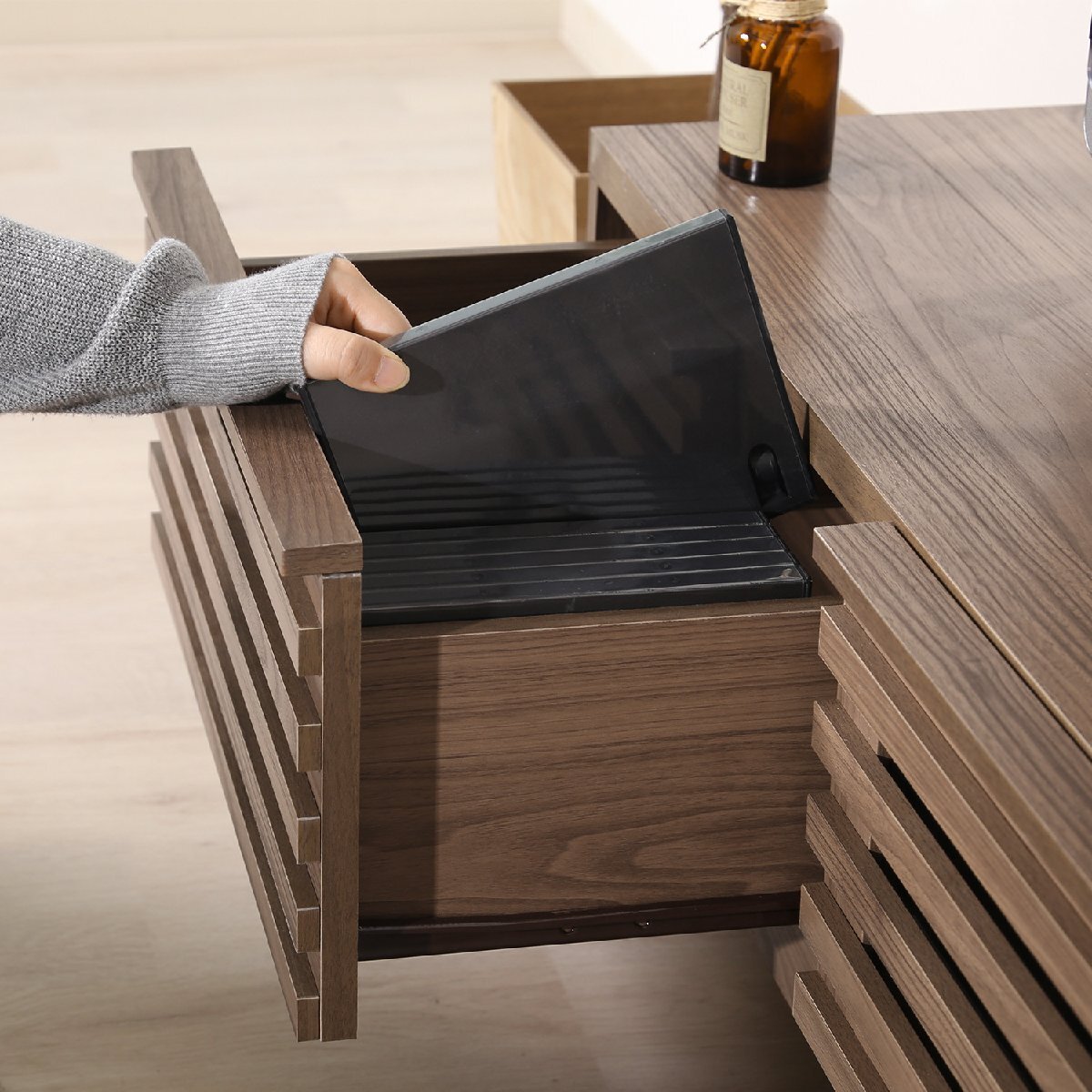 サイズ | 全体:幅1500 × 奥行420 × 高さ385mm 耐荷重(天板):40kg(50V型まで対応) 引出内寸:425x335x150mm 収納内寸(左):475x365x185mm 収納内寸(右):475x365x185mm コード穴直径:50mm 脚部高さ:100mm ※詳細はサイズ画像をご確認ください。 |
