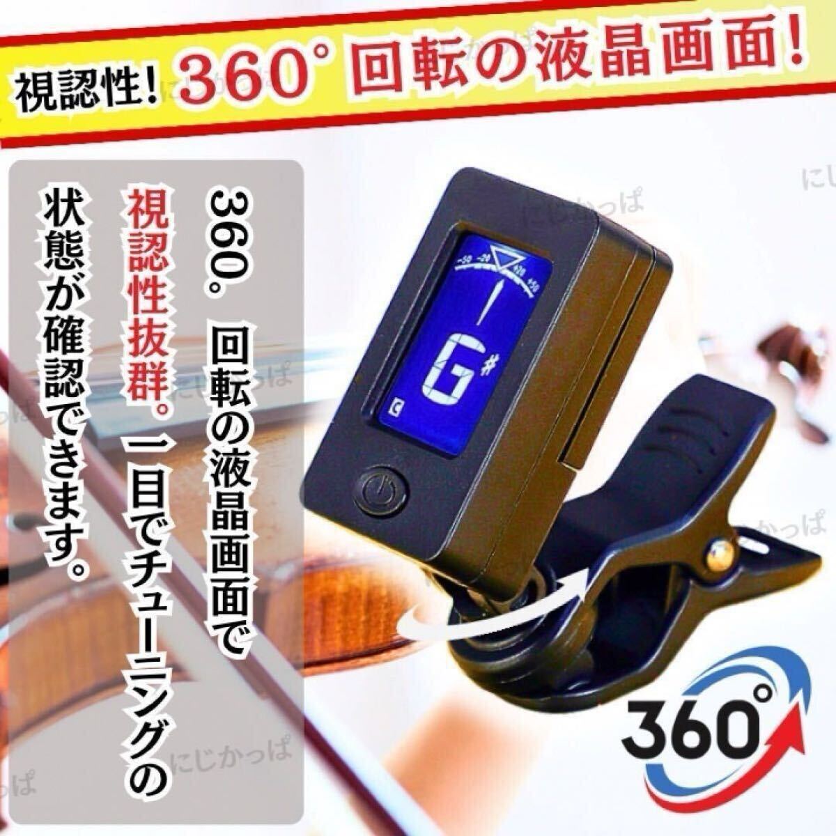 テスト電池付きなので、届いたその日からすぐ使えるのが嬉しいポイント。クリップ式なので楽器の振動だけをキャッチ。外部の騒音に左右されることなく、いつでもどこでも確実にチューニングができます。しかも、チューナー本体は360°回転可能。視認性もバッチリ。