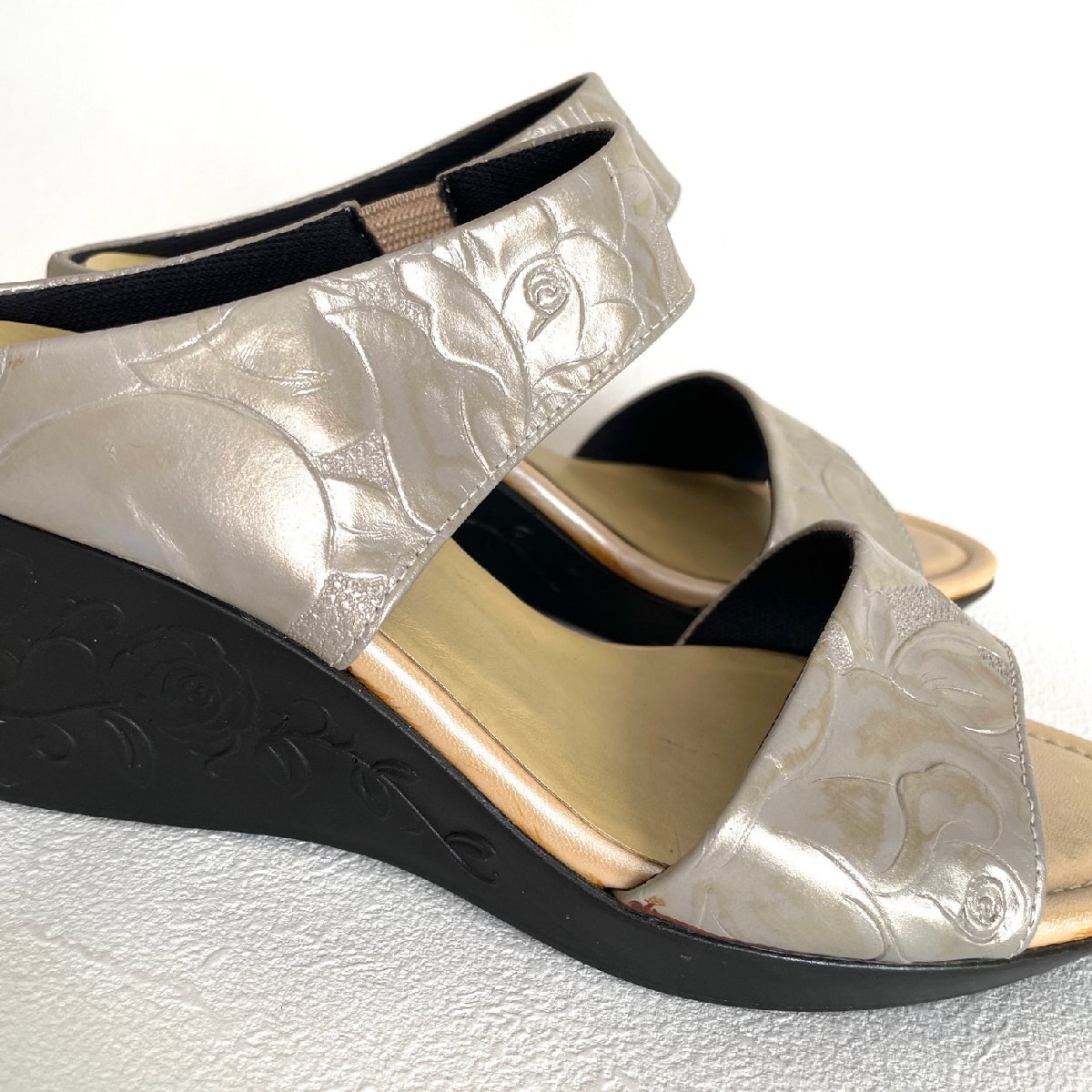 商品説明 ヒール慣れしていない方や足の疲れやすい方にオススメのサンダルです。 ソールの安定したウェッジソールなら接地面積が広く着地がぐらつかないため、歩きやすいです! 詳細 ●サイズ:Lサイズ ●カラー:シルバー×ベージュ×ブラック ●ランク:Bランク ●コンディション:新品、未使用ですが経年劣化による接着剤の変色が所々みられます。 シルバーの部分にも変色がみられます。 |