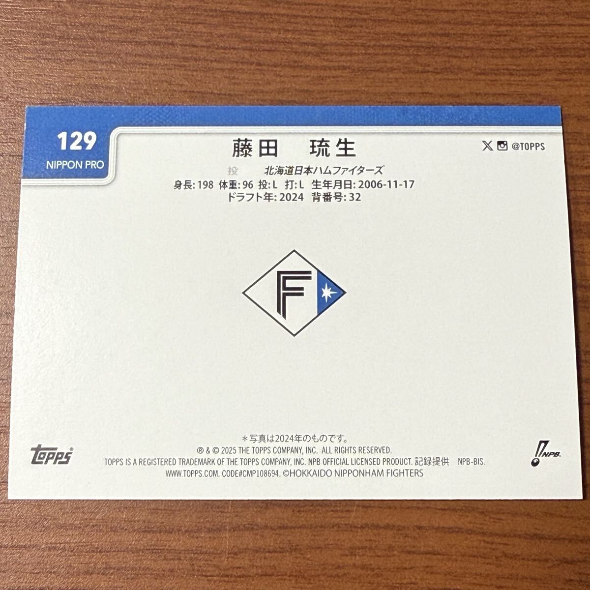 TOPPS NPB 2025 北海道日本ハムファイターズ 藤田琉生 ベースカード ルーキー 129