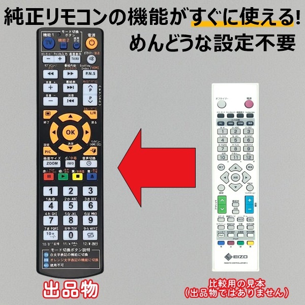 | 【商品名】 EIZO MR-5 代替リモコン 【対応機種】 FX2431TV 用 比較画像の右側の純正リモコンが付属する機種に使用出来ます。 上記機種以外については、質問欄よりメーカーと型番をご連絡頂ければ、対応品のご案内をしております。 【商品について】 左側の代替リモコンが出品物になります。右側のリモコンは見本画像です。 タイトル機種のリモコン信号を入力した、設定不要で使える純正品と同等の代替リモコンです。 乾電池は付属しません。別途ご用意下さい。(単4乾電池×2本) 【商品サイズ】 縦18.5cm×横5cm×高さ2.35cm 【発送について】送料無料 迅速発送を心掛けております。土日祝日はお時間を頂く場合ございます。 ポスト投函配達となり、日時指定は出来ません。 | ||