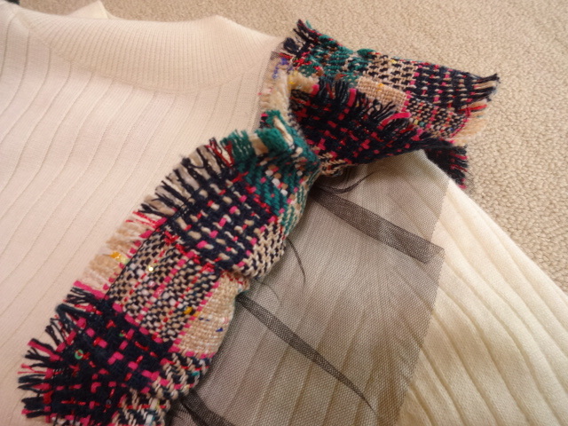 チェック柄フリンジはツイード調生地で肩口上に縫い留められており、下には黒色チュールがついています。