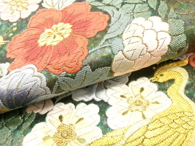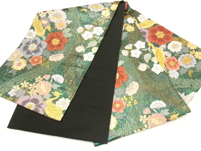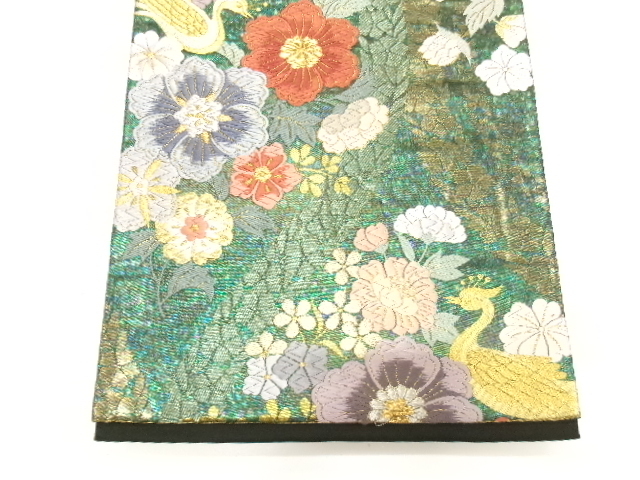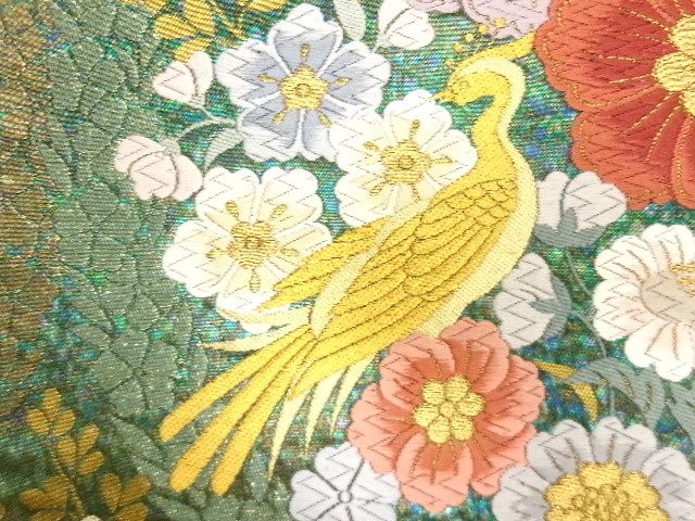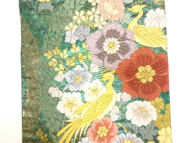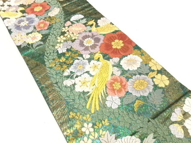 美品 尾長鳥に草花模様織り出し 袋帯 (IBD3K-005)