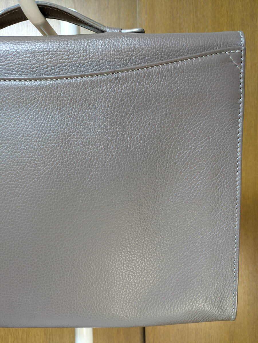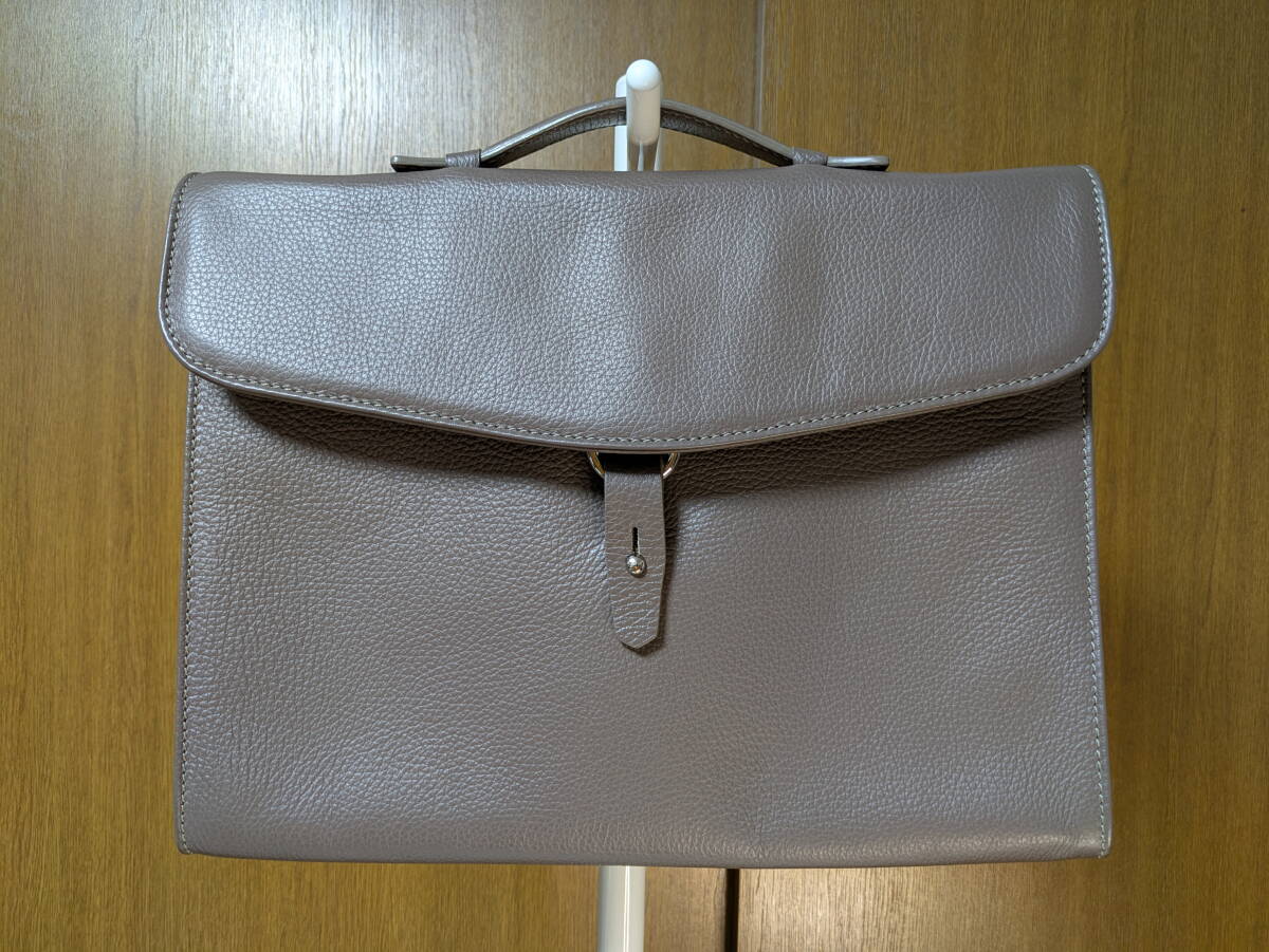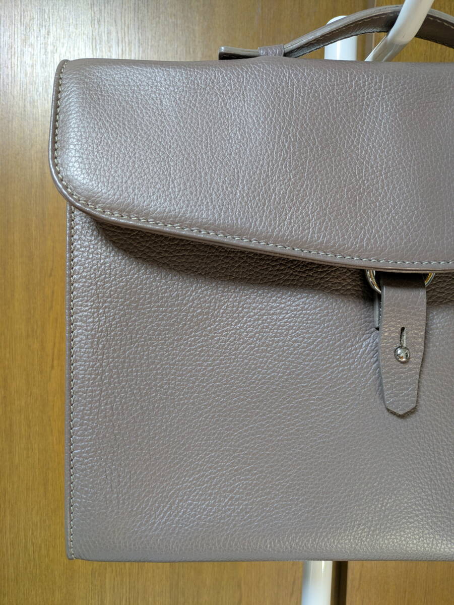 ステファノマーノのビジネスバッグになります。シュリンクのカーフレザーです。濃い目のグレージュなのでスーツの色に合わせ易いと思います。2016年頃の製品で使用頻度も低く目立ったダメージのない綺麗な状態です。是非ご検討下さい。