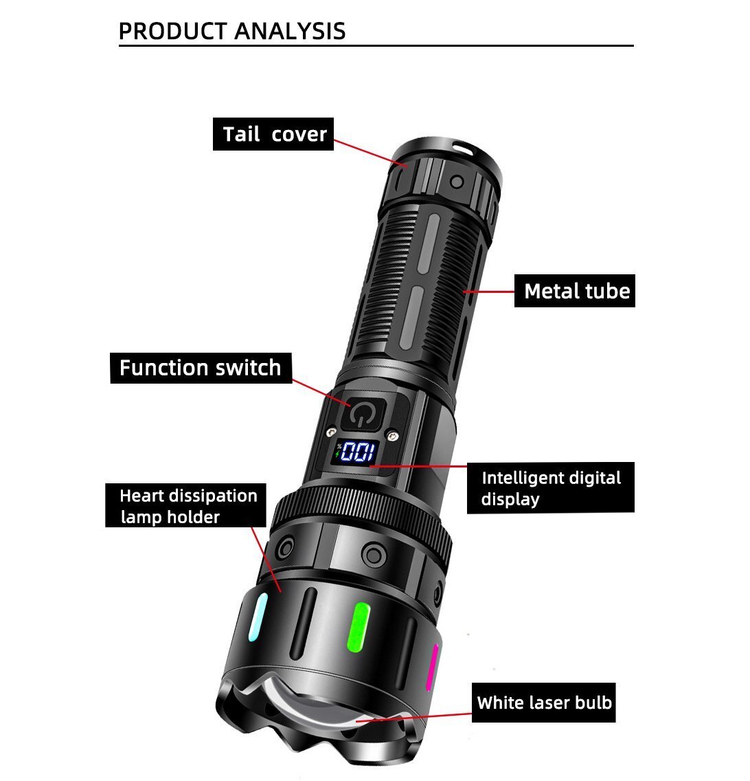 ■5000mahの大容量、20W白色レーザー懐中電灯、5速切り替え、日常生活防水防雨、アウトドア、緊急時、夜釣り、冒険など様々なシーンでの使用に適しています。