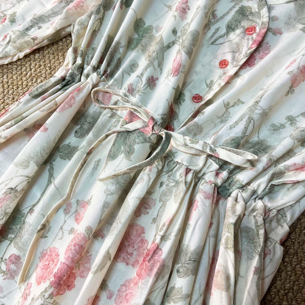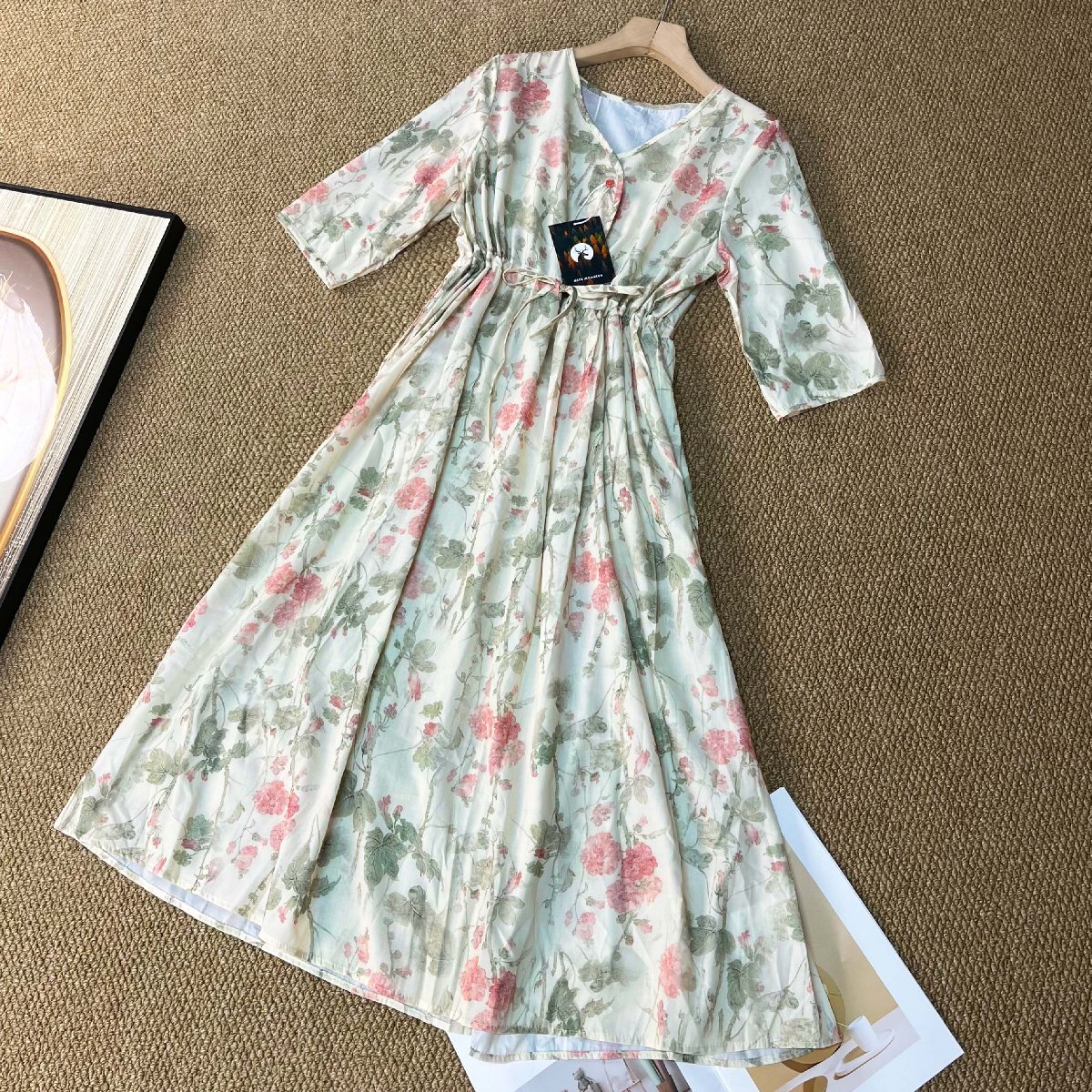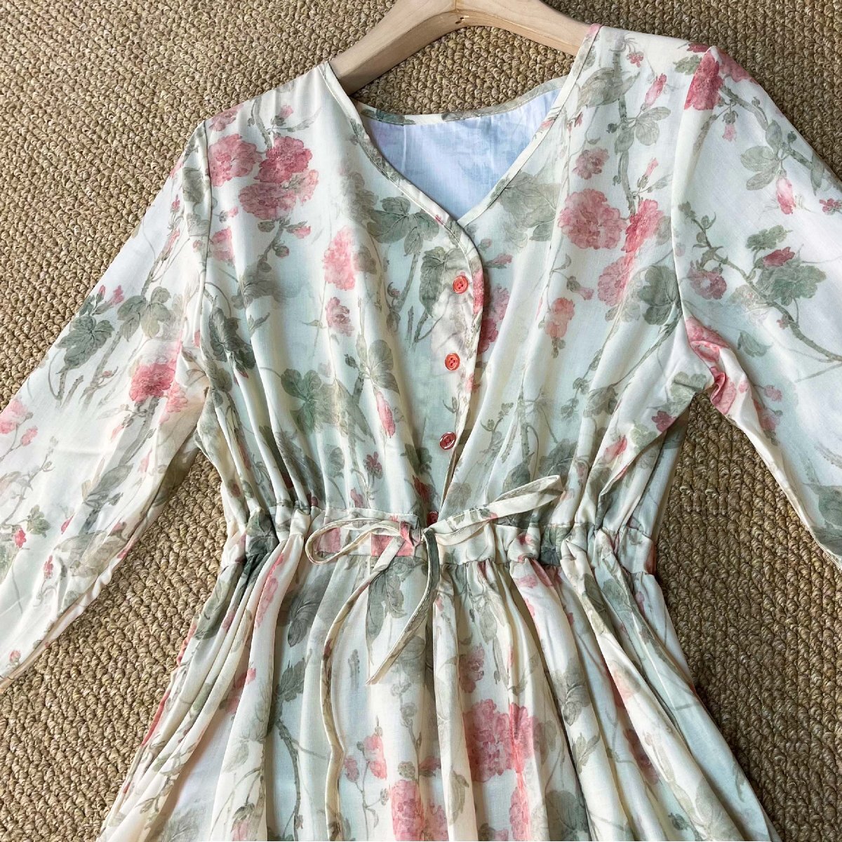 全体的にはきれいな花柄を繊細にあしらい、夏らしく爽やかでフェミニンな印象を演出。Vネックでデコルテを綺麗に見せ、エレガントな雰囲気を演出します。ウエストはゴム仕様で調節用の紐も付属しており、脱ぎ穿き楽ちん!!ハイウエストデザインで脚長効果があり、ラインもすっきり美しく見えます!ふわっと揺れるロングワンピースが上品さや華やかさを演出。
