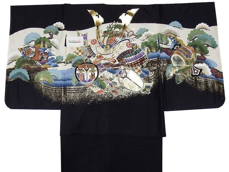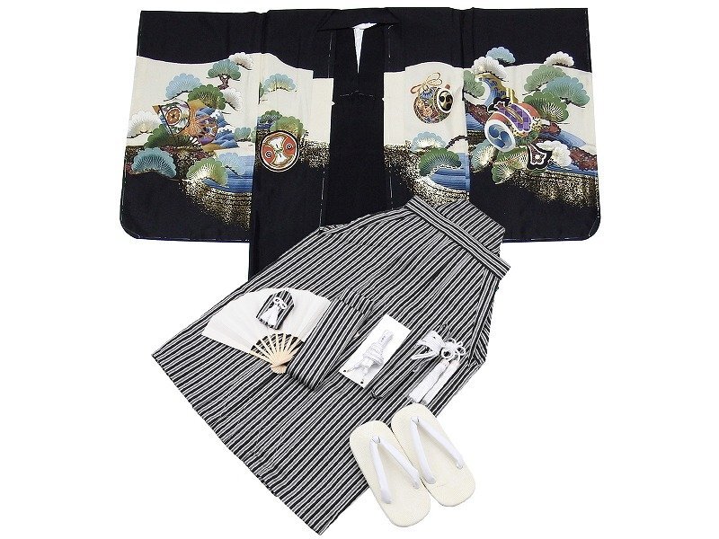 ■七五三 男の子用■男児 アンサンブル 着物 &袴 フルセット 黒地 兜 着丈100cm 5h-144 【アンサンブル& 袴 の豪華なセット!】