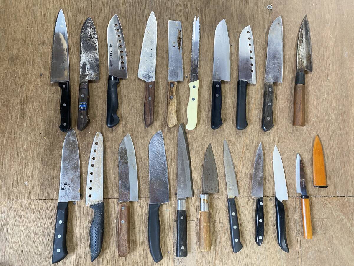 タイトル:E-726 【同梱不可】980円~ 現状品 包丁まとめ 20点セット 周富輝/秀宗/近景/関孫六/兼守/藤十郎作 等 万能包丁 刃物 ナイフ