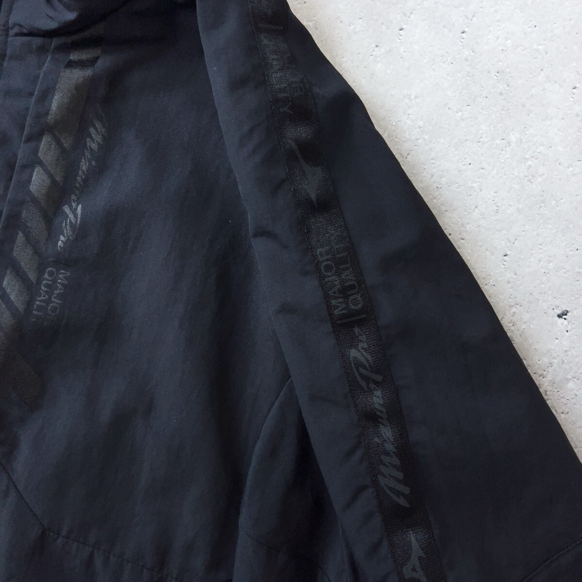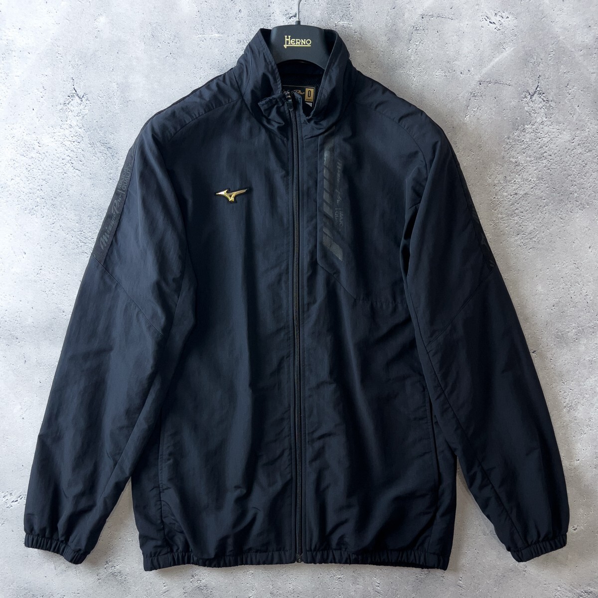 スタイリッシュなブラックにゴールドのロゴが映え、品のあるスポーティさを演出します。肌寒い季節のランニングや野球のウォームアップ、移動着としても重宝します。
