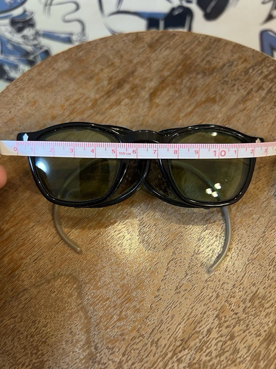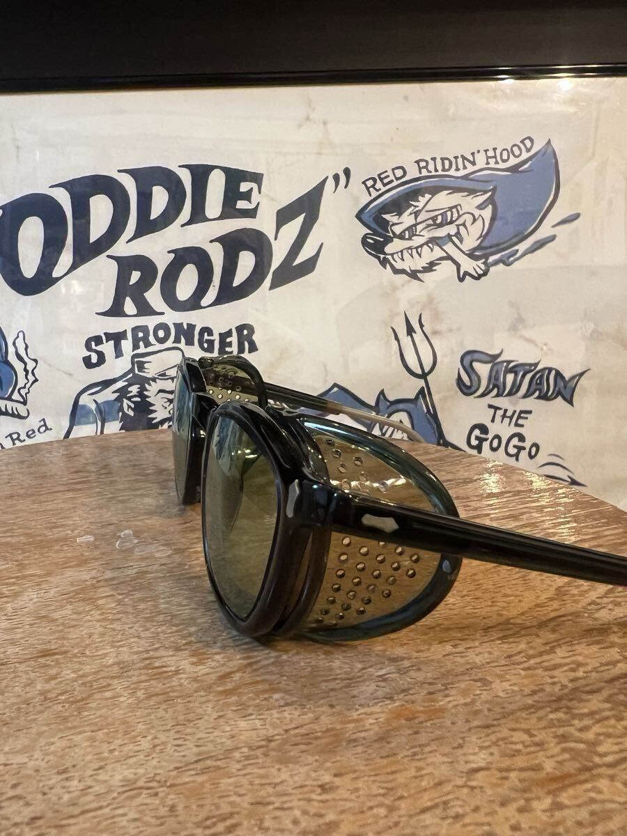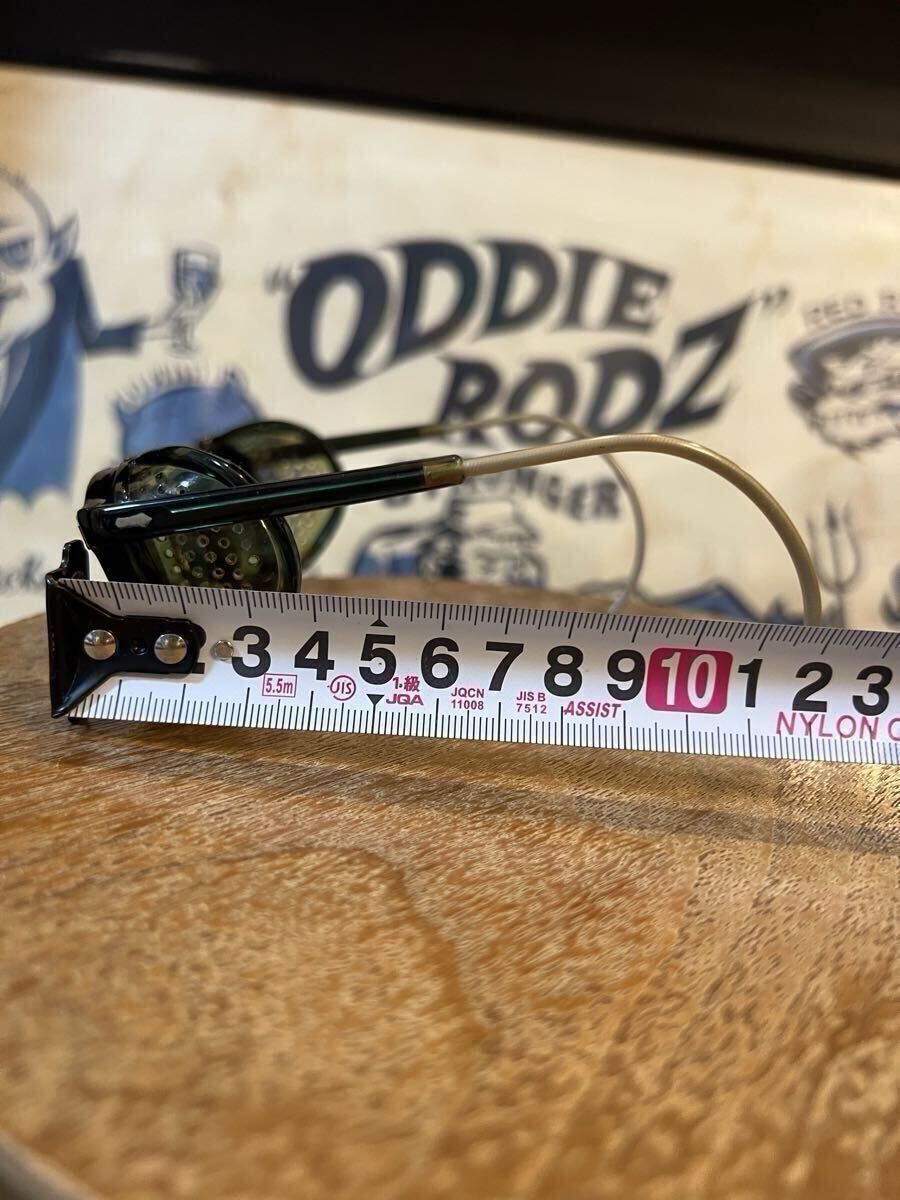 ビンテージのセーフティーグラスです年代は忘れてしまいました。ビンテージですが結構綺麗ですレンズはAOの文字の入ったオリジナルのガラスレンズで目立つ傷はありません。サイズは見づらいですが44-22の刻印あり、10年位前にバイク用に購入しましたが縄手テンプルが地道にストレスでヘルメットを被った状態では着け外しが出来ないのと自分にはサイズが少し小さかったですサイドガードの跡が顔に付いてしまいます、サイドガード無しにしてしまったら大丈夫なのですがこれが格好良くて買ったので外す気にならずで着用頻度低く手放す事にしました。凄く格好良いですよ!欲しい方は是非!