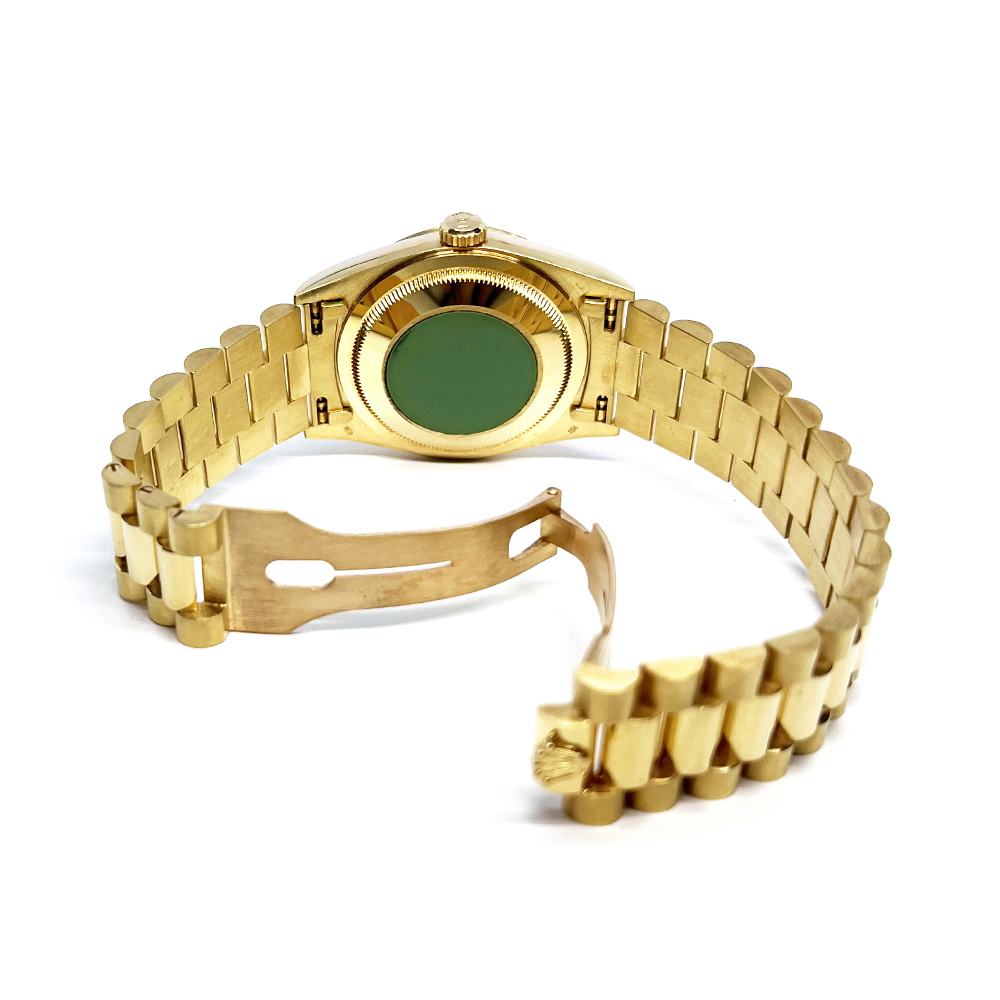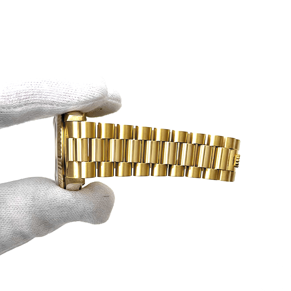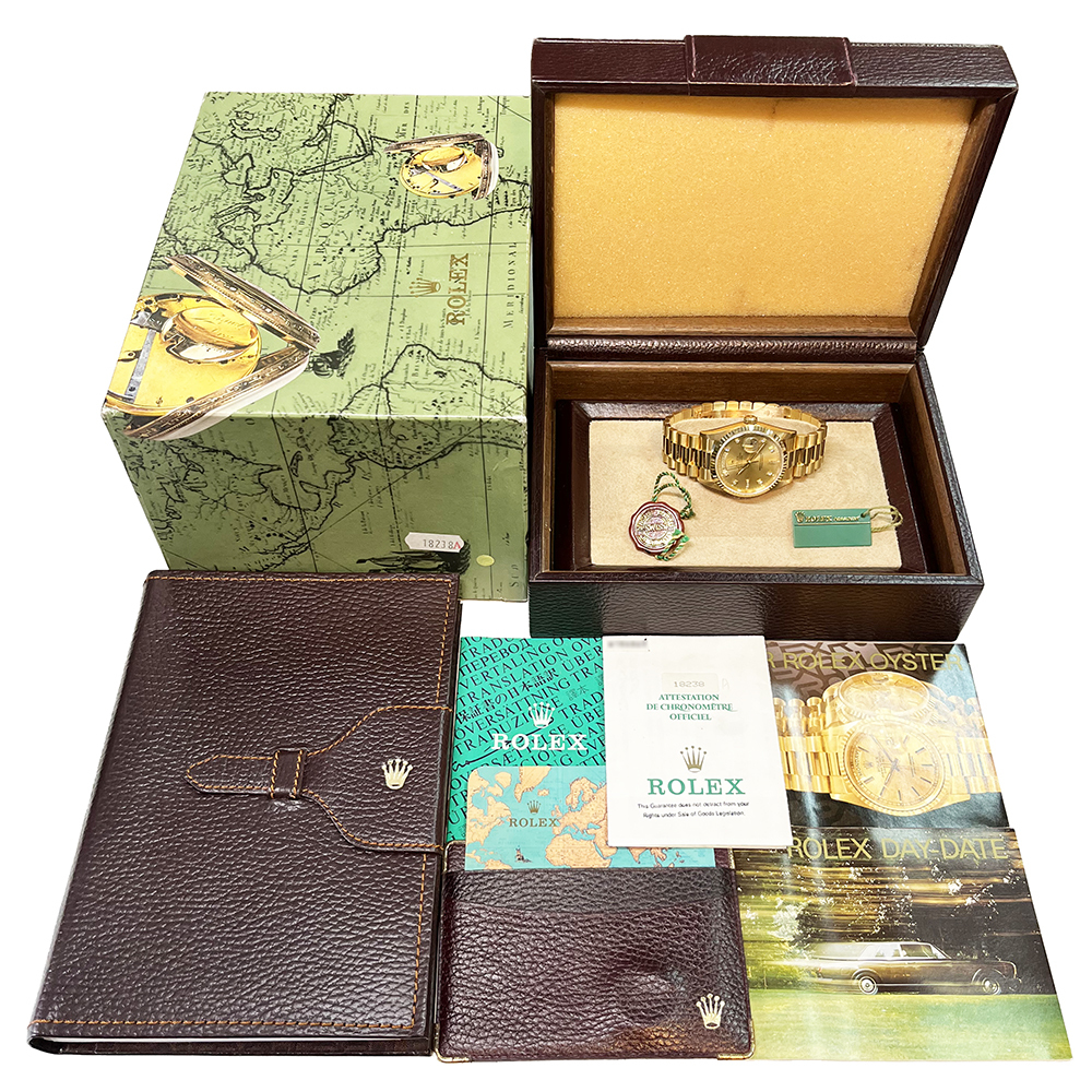 コメント | ロレックス デイデイト 18238A が入荷しました。ロレックスで唯一のフルスペルの曜日表示を備えるデイデイトは、手にしたユーザーにワンランク上のステータスと満足感を与えてくれます。腕元に馴染む36mmイエローゴールド無垢のケースは高級感が溢れ、最高峰モデルに相応しい仕上がりです。本品は目立つ傷のない非常にきれいな状態です。ギャランティにイギリスで購入した記載がございます。日付の記載はありません。 ~出品担当の福井より~ 手首にかかる圧倒的な重量感は、羨望の眼差しを集めるに余りあるゴージャスさがあり、数ある高級腕時計の中でも群を抜く至高のモデルです。 | ||