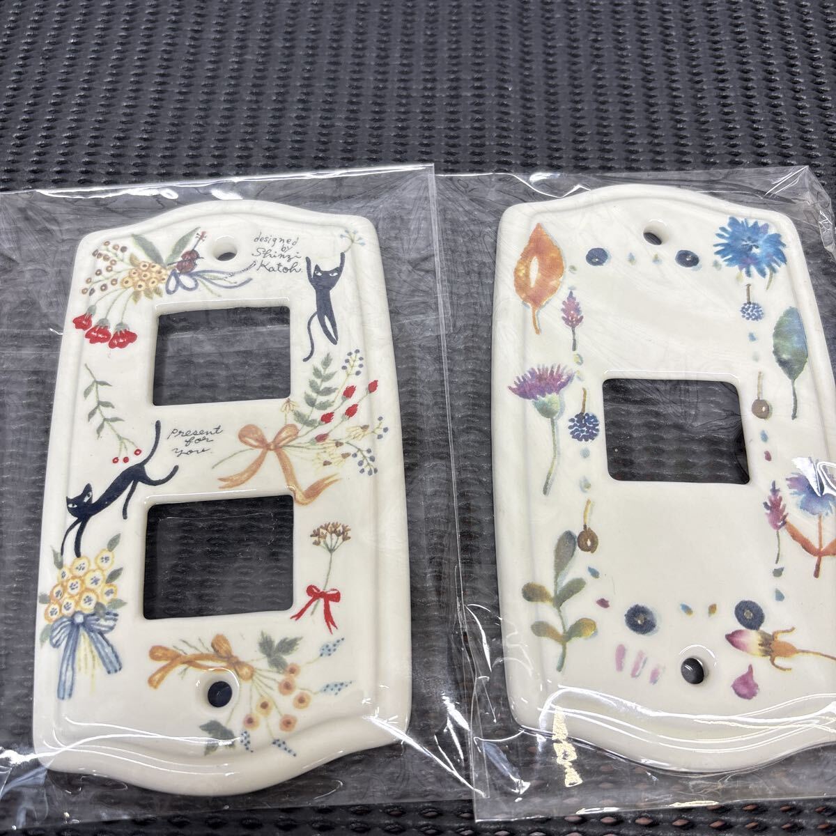 ★大阪/店舗受け取り可★スイッチカバー プレート 陶器製 2枚セット14cm×8cm 花柄 黒猫 インテリア おしゃれ 入れ替え DIY★