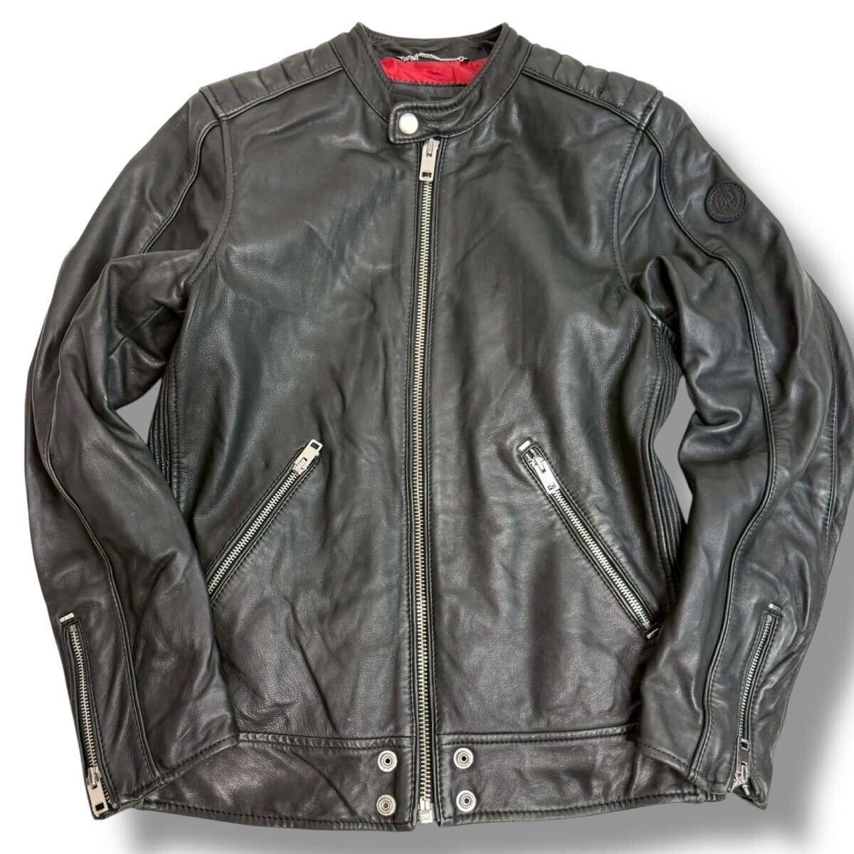 922【希少】DIESEL ラムレザー シングル ライダース ジャケット 黒 ブラック 羊革 ディーゼル 裏地赤 レッド ブルゾン ロゴワッペン M相当
