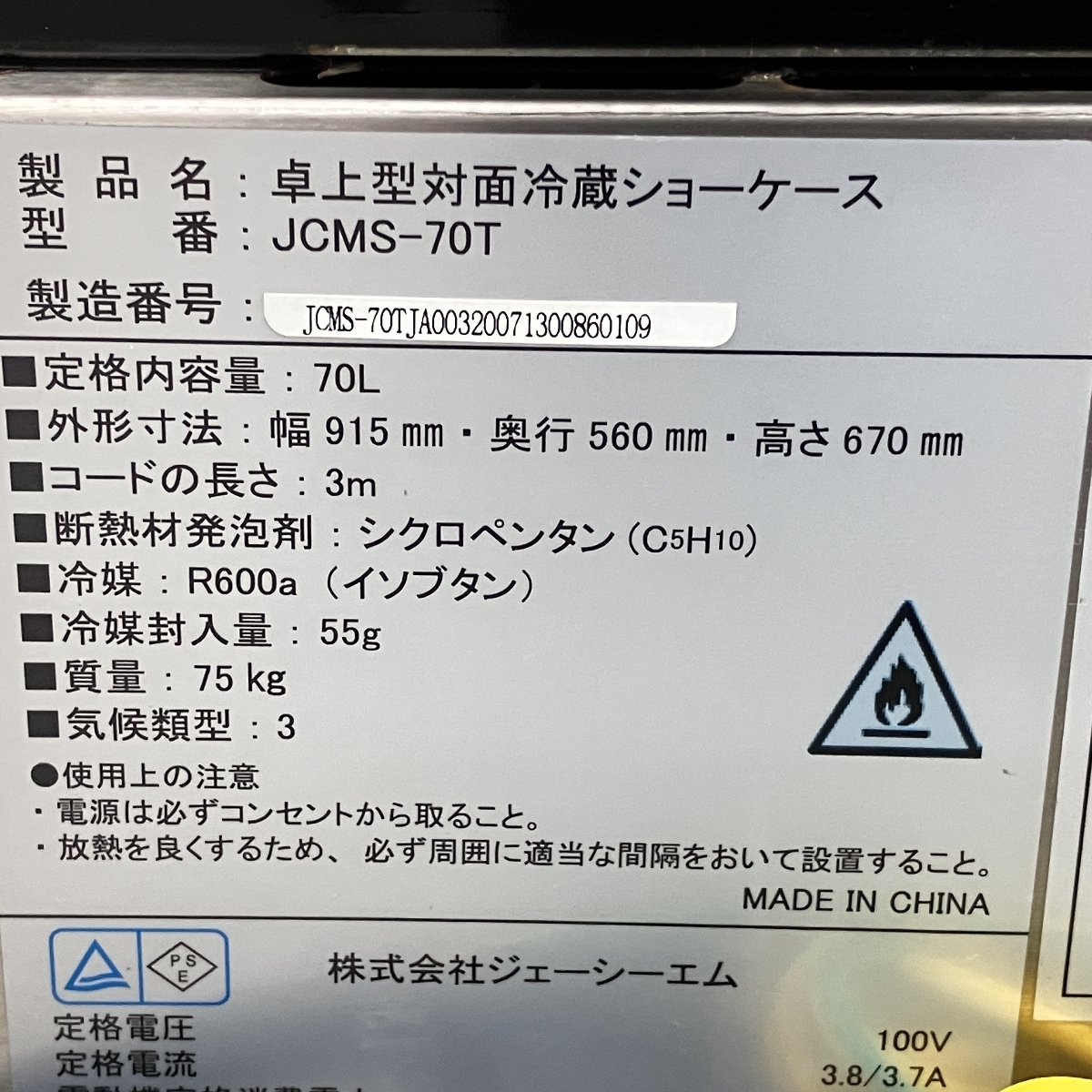【店頭受取限定】JCM JCMS-70T 対面冷蔵ショーケース 卓上型 業務用 100V 角型 ジャンク 直 F10329852 |