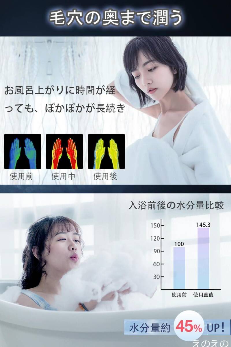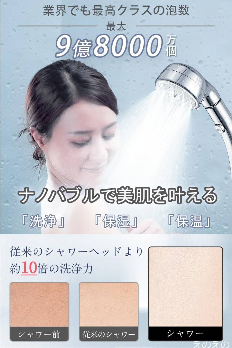 【洗浄力抜群&マイクロナノバブル】ウルトラファインバブルが水中に生成されており、業界でも最高クラスの泡数、約9億8000万個の超微細な気泡が毛穴に浸透し、ファンデーションによるキメ汚れや頭皮の汚れもスッキリ洗浄しますので、手が届きにくい背中汚れの洗い流しにぴったり。散水板は極細穴を採用して、空気対流の面積を縮んで、細くても高速な水流を実現しています。普通のシャワーより細密で、快適で、水圧の低い施設高層階でも快適な水の勢いでご使用いただけます。微細ミストシャワーは通常シャワーと比べると 肌への刺激が約半分!顔などデリケートな部分へ負担をかけず洗い流すことができます。更にマイクロナノバブル(1μm未満)が肌に深く浸透し、通常の水では落としきれない汚れや油脂を徹底的に除去し、残ったメイクもスッキリ。