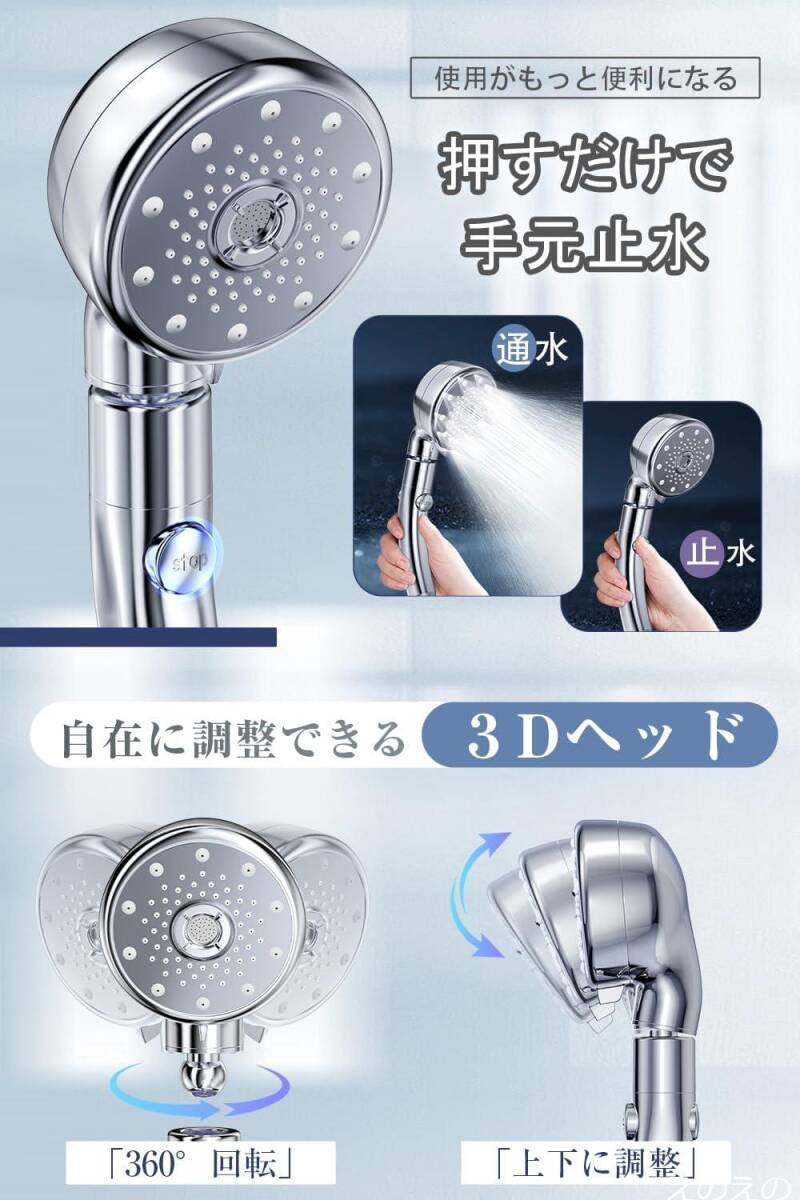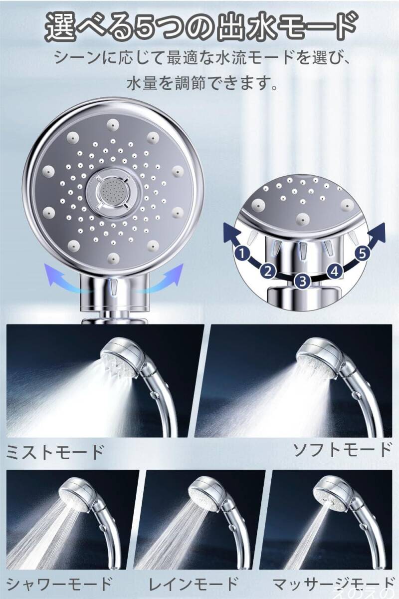 【左右360度・上下60度の回転で自由自在に角度調整&五つの水流モード】上下60°、左右360°の回転が可能になり、自由自在にヘッド角度を調整できるので赤ちゃんやペットの入浴にも役立ちます。シャワーフックにかけたまま、浴びたい位置に散水方向を自由自在に調整できるので、体を動かさずに全身の隅々まで徹底的に洗い流せます。全身をケア、浴びる部位や目的に合わせて選べる五つの水流モードで手元で簡単に切り替えできます。ミストモード:顔など刺激を避けたい部分に最適。ウルトラファインバブルの発生により、肌の細部や毛穴の汚れを優しく洗浄しながら、肌を柔らかく保ちます。ソフトモード:ミストとシャワーが同時に出る、マッサージするように洗って癒しのひと時を。疲労を解放し、ストレスを軽減したい方におすすめ。マッサージモード:髪や体を洗うのに最適。強めの水流でサッと洗い流す。シャワーモードは全身を効率的に洗いたいときに、レインモードは頭皮の汚れを洗い落としたいときに役立ちます。