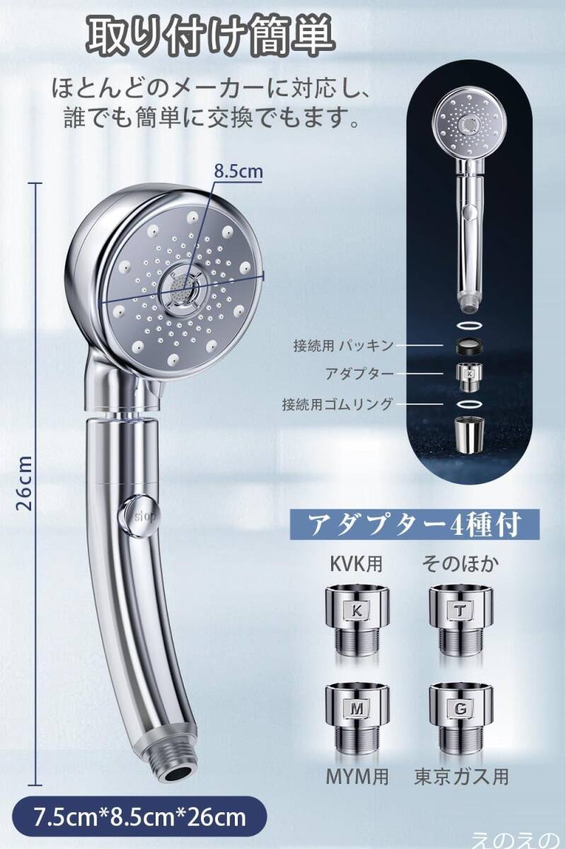 【高品質・簡単取付&セット内容】耐衝撃性と防錆素材を使用し、高い基準の工芸技術で製造されています。光沢感と高級パッケージで、理想的なギフトとしてもおすすめです。国際汎用基準G1/2インターフェース通用デザインで、ご家庭のほとんどのシャワーに取り付け可能です。工具不要なのでとっても簡単。初めてインストールする場合でも、そんな時間がかかりません。アダプター(K/M/G/T --4種類)で取り付けることができ、ほとんどのメーカーに対応可能です。※【パッケージ内容】シャワーヘッド本体×1台、接続用ゴムリング×4個、接続用パッキン×4個、アダプター(K/M/G/T)--4種類、シールテープ1個、取扱説明書×1部。ご使用中に何か問題が発生した場合は、いつでもお気軽にお問い合わせください。お客様の満足が私たちの最優先事項です。( ご注意:最新型のシャワーヘッドなので、一部分のTOTO製(旧製品)を対応できない可能性があります。)
