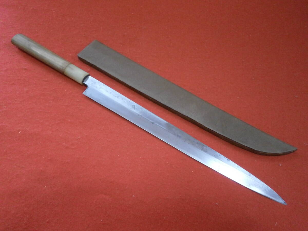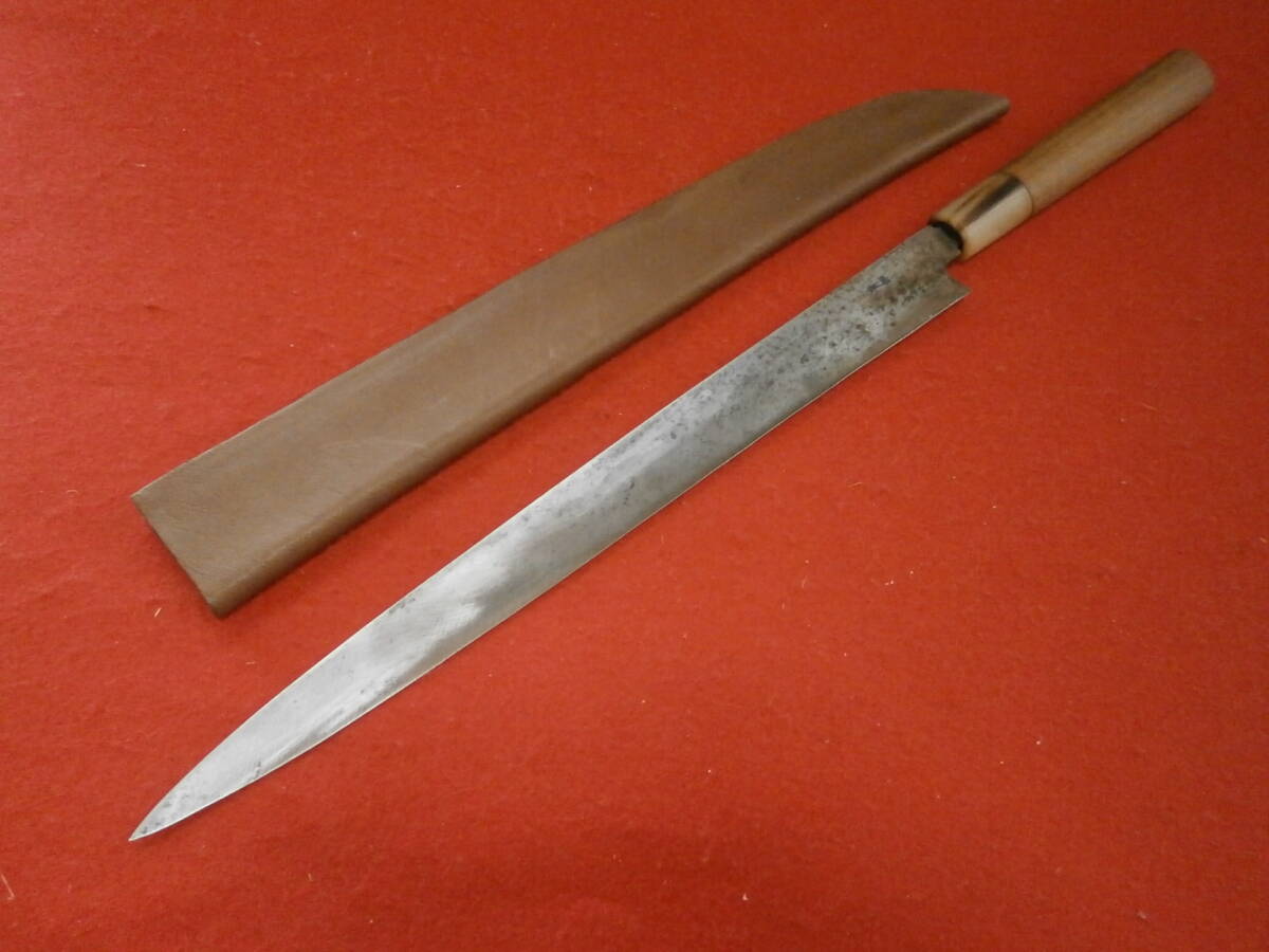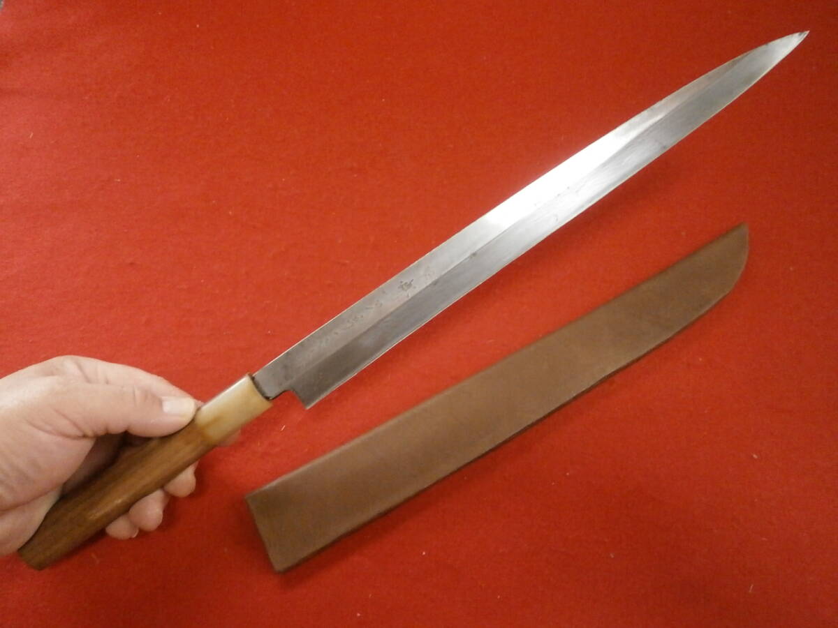 【売切り】 全長45cm 高級柳刃包丁 在銘「菊一文字」? 安来鋼使用 在銘 刺身包丁 柳刃包丁 和式ナイフ 片刃 本革ケース付き