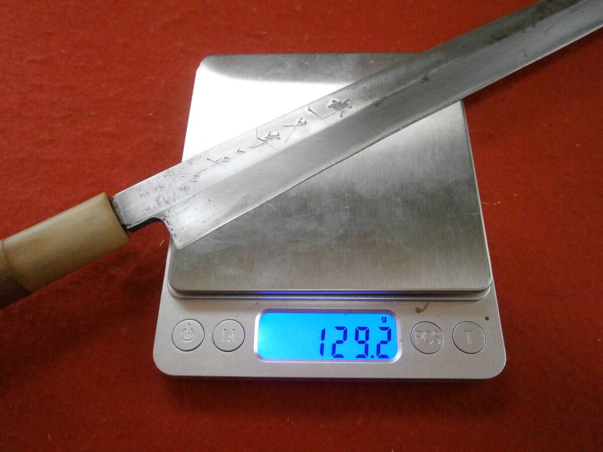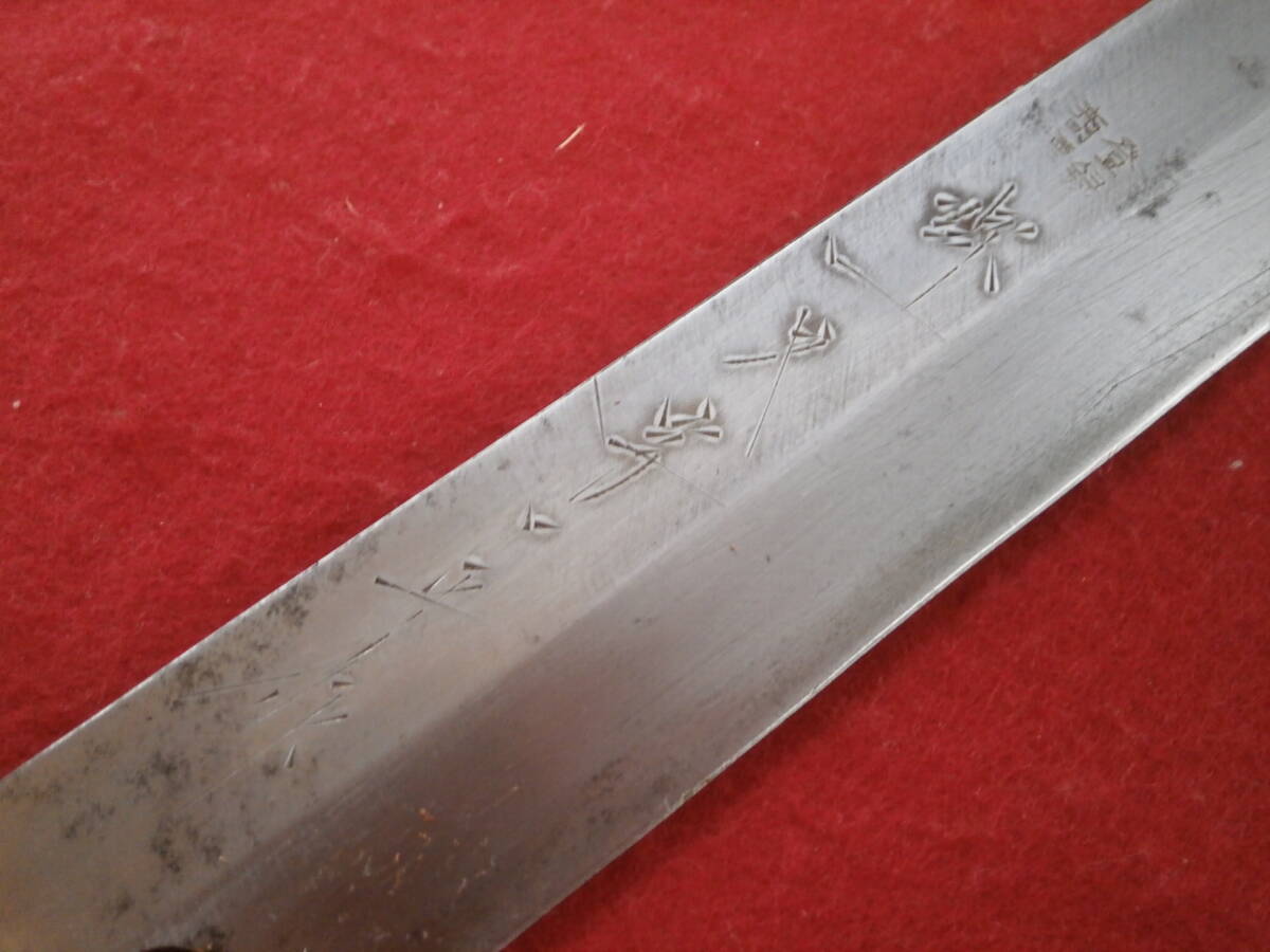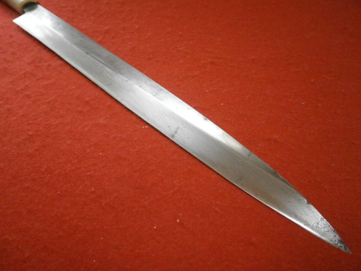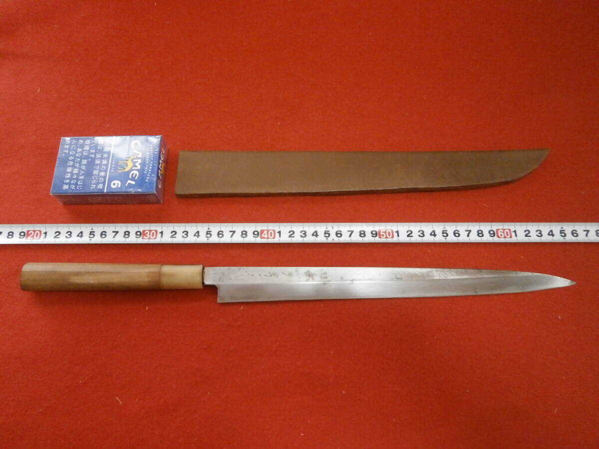 【売切り】 全長45cm 高級柳刃包丁 在銘「菊一文字」? 安来鋼使用 在銘 刺身包丁 柳刃包丁 和式ナイフ 片刃 本革ケース付き