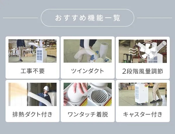 通常のスポットエアコンは1人に対し決まった個所へ効果をもたらしますが、此方のツインダクトは2人へ、上半身と下半身へ等使い方を選べます。便利です。