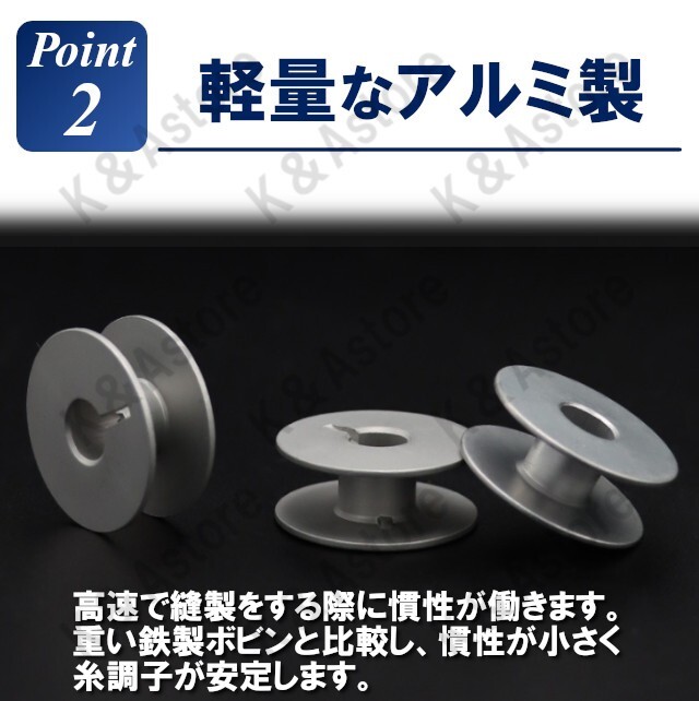 高速な縫製をする際に慣性が働きます。重い鉄製ボビンと比較し軽量なアルミ製ボビンは慣性が小さく糸調子が安定します。