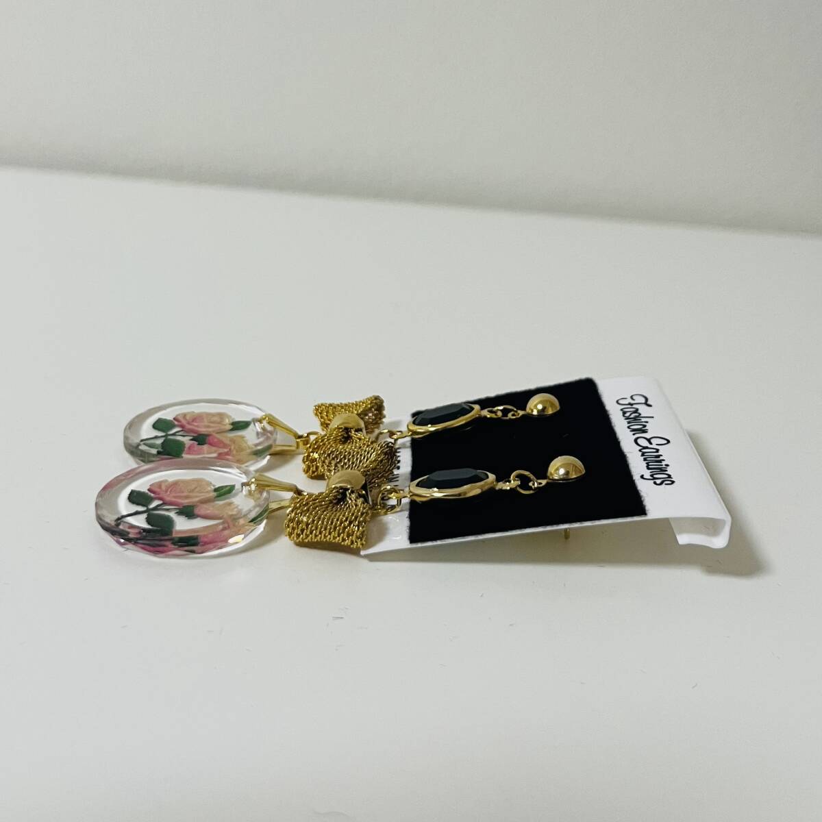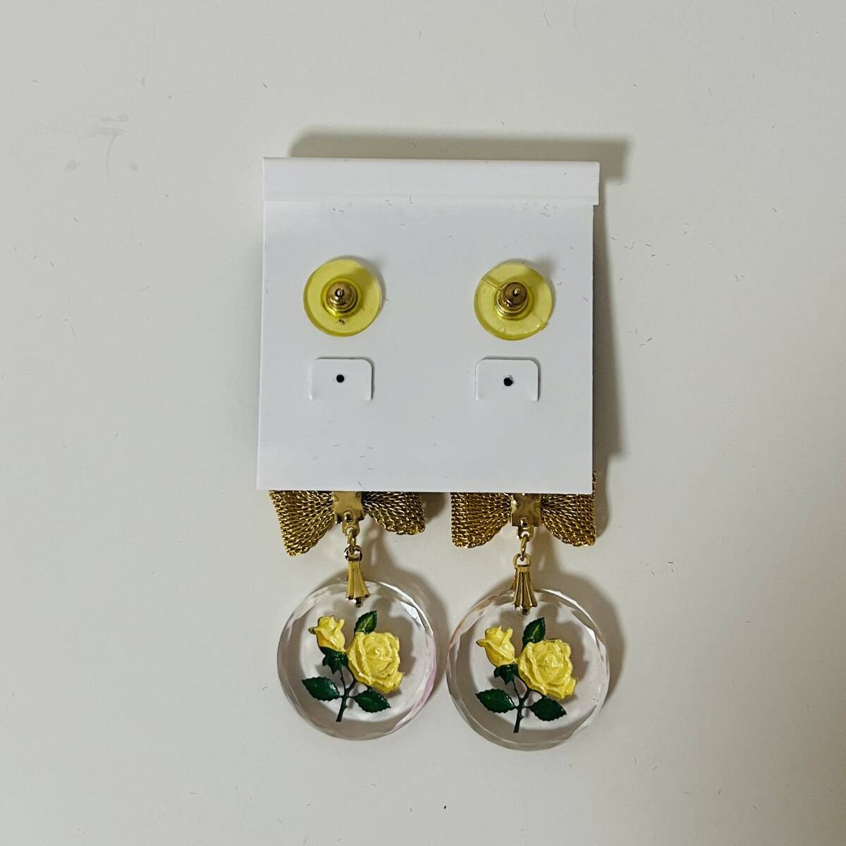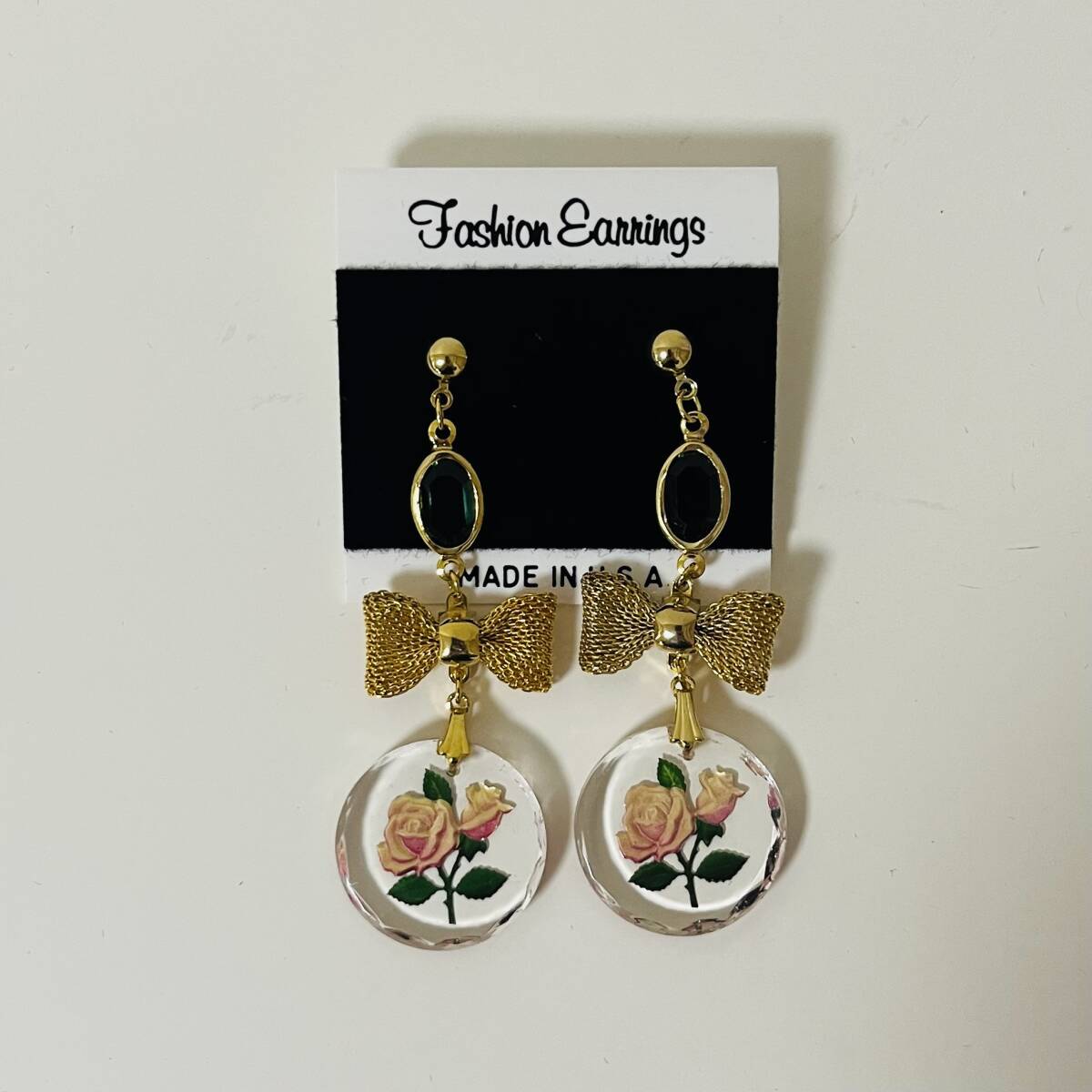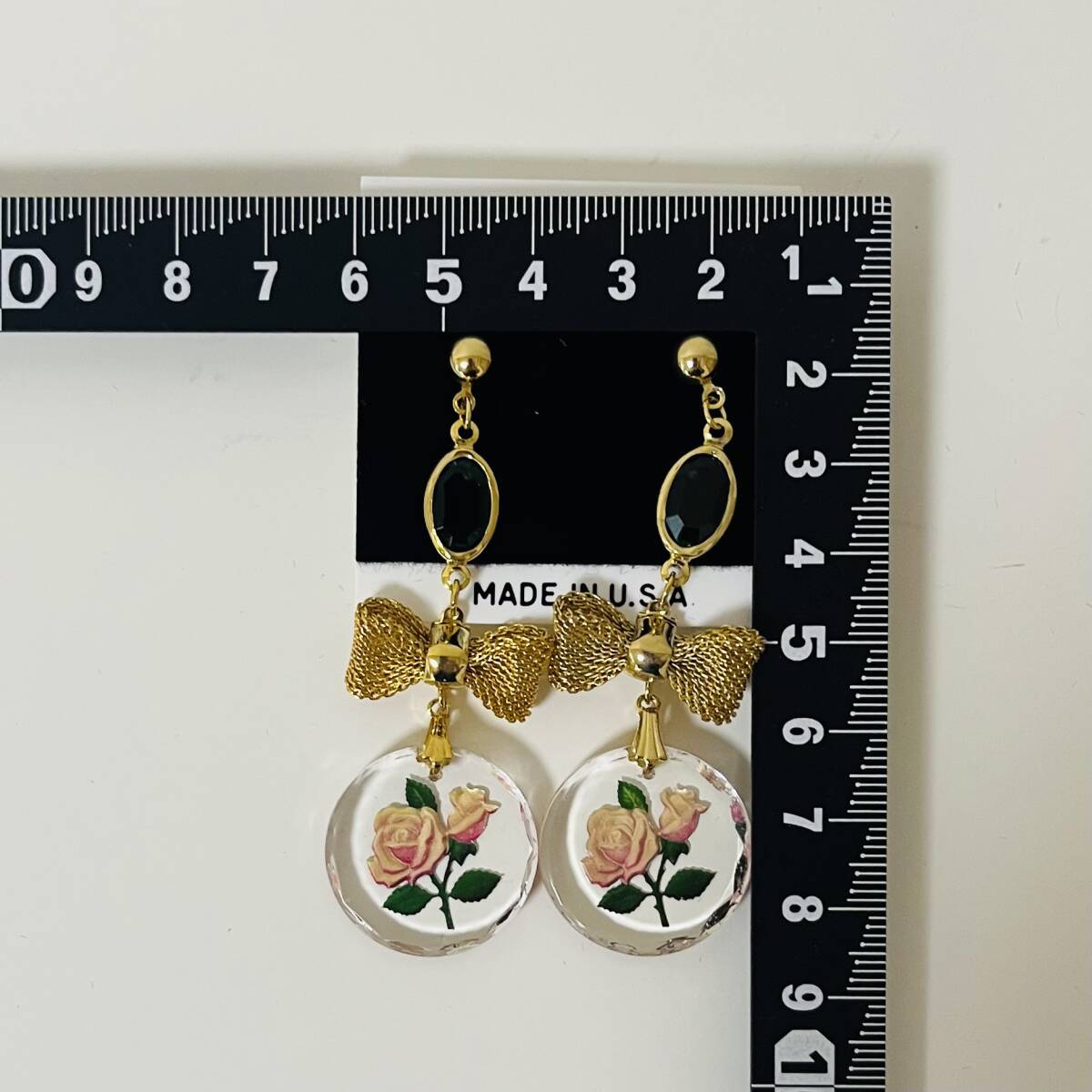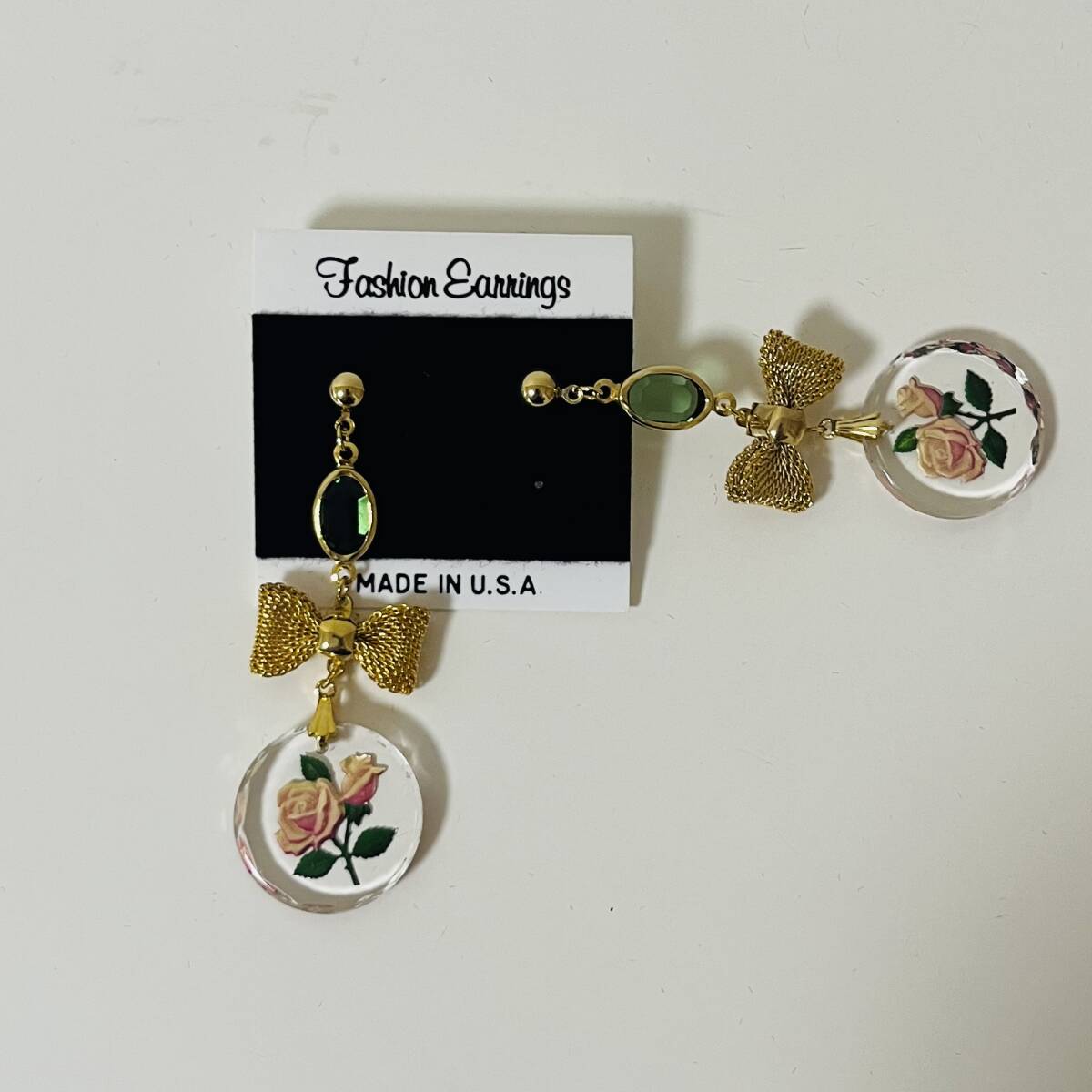 431③アンティーク ビンテージ アクセサリー ピアス 台紙付き 未使用保管品! ゴールドカラー カラーストーン リボン 花 フラワー 緑 揺れ感