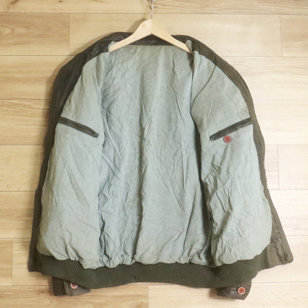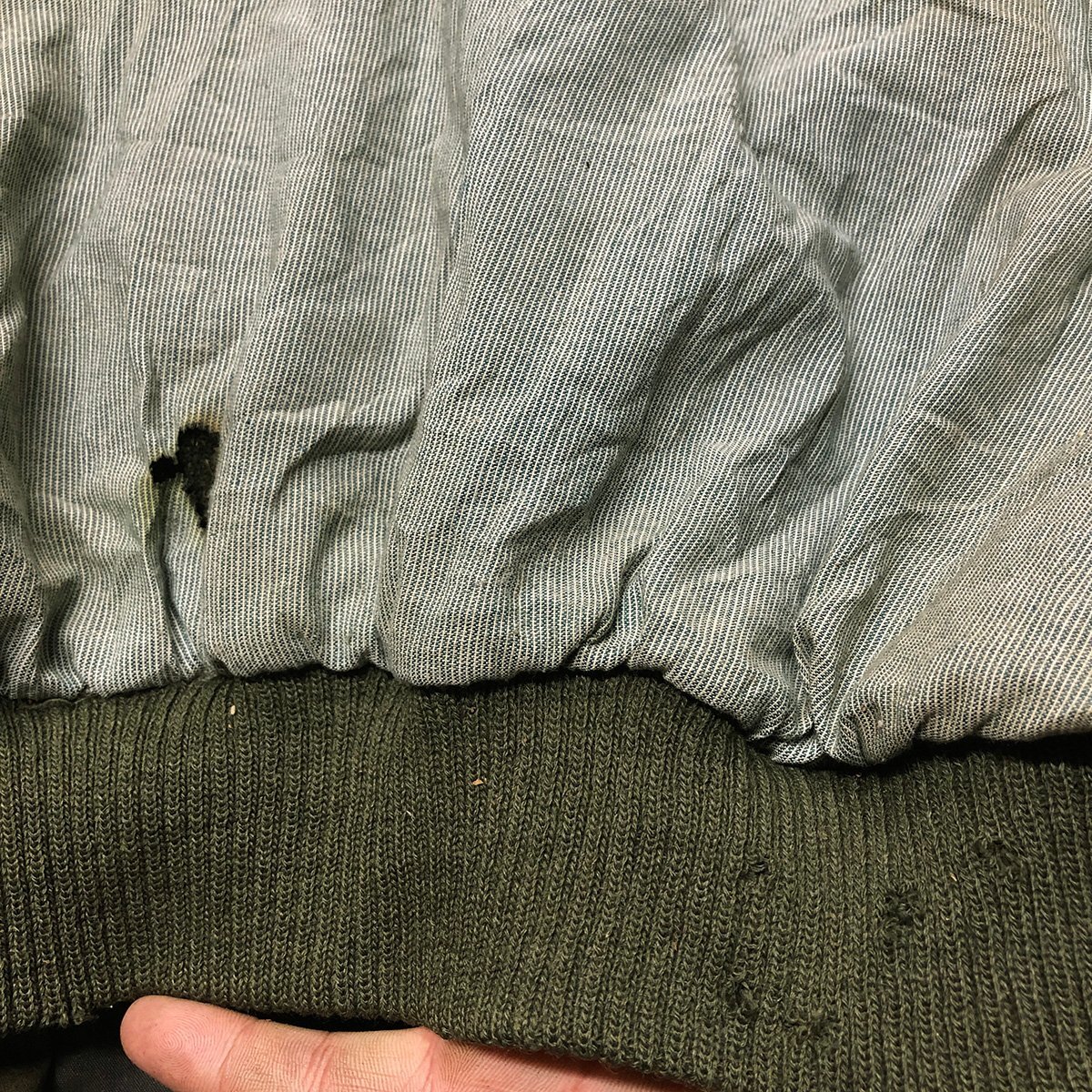 中古品です。使用感があります。全体的に経年による擦れや変色、裏地首周りや脇や裾など全体的に汚れ、裏地裾やリブにホツレや破れ、襟のジッパーに歯抜けがあり開閉できません。