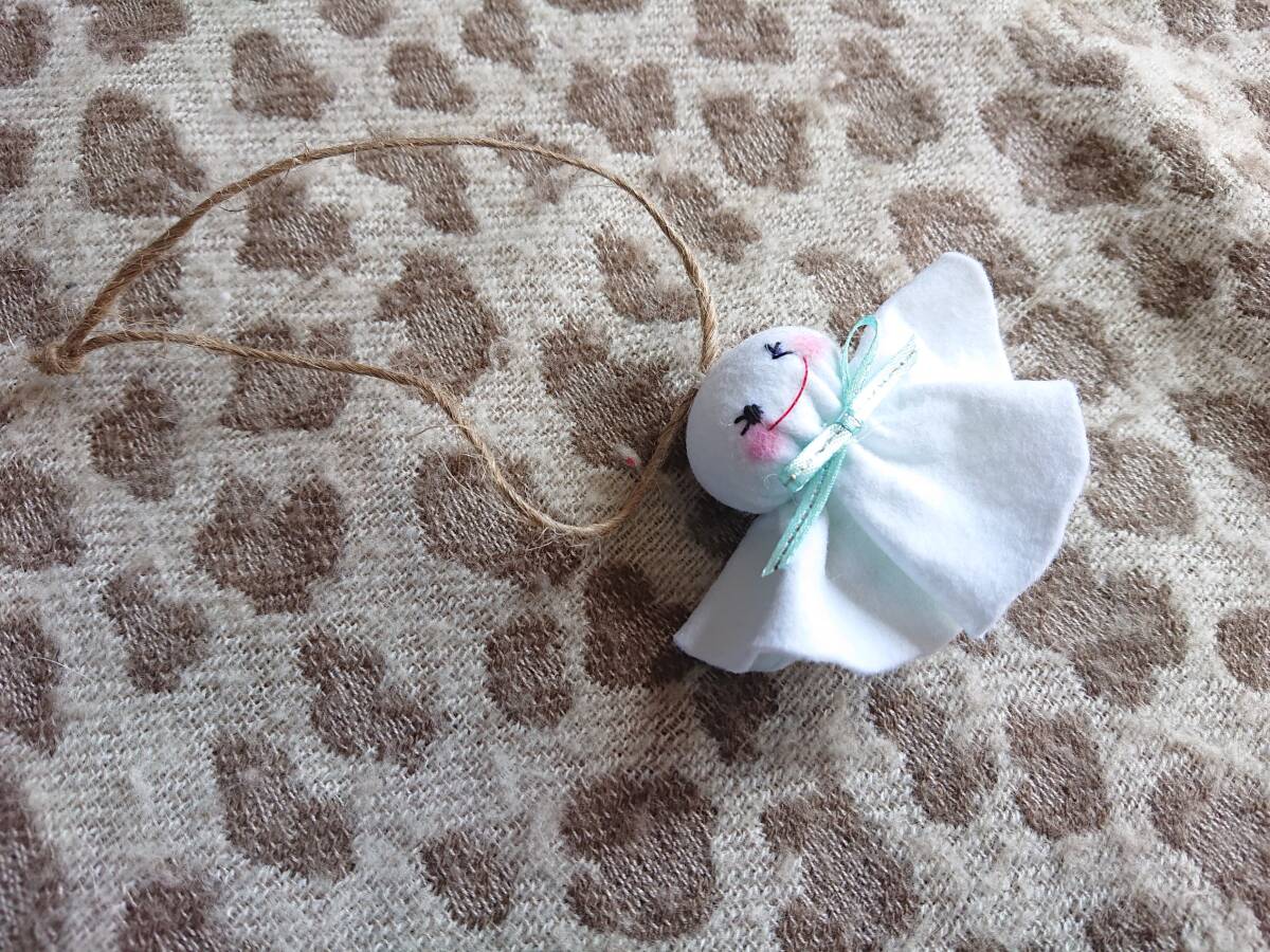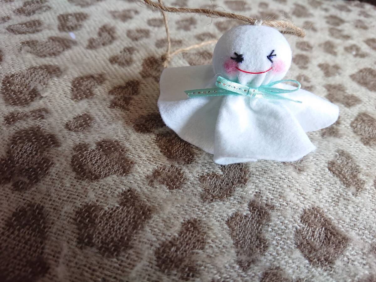 フェルトで作ったかわゆいてるてる坊主です。ほんわかほっぺは、チークで色づけしました。てるてる坊主の高さ約5,5センチあります。あさひもで、引っかけてぶら下げてください。