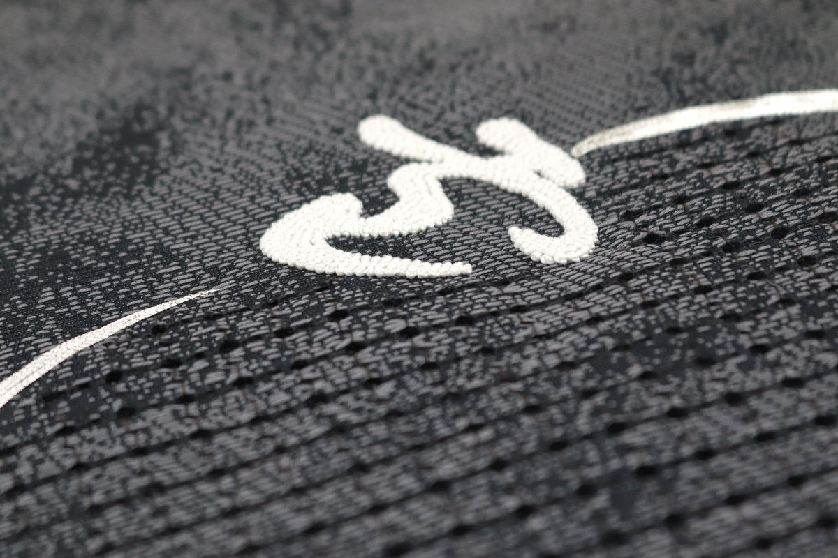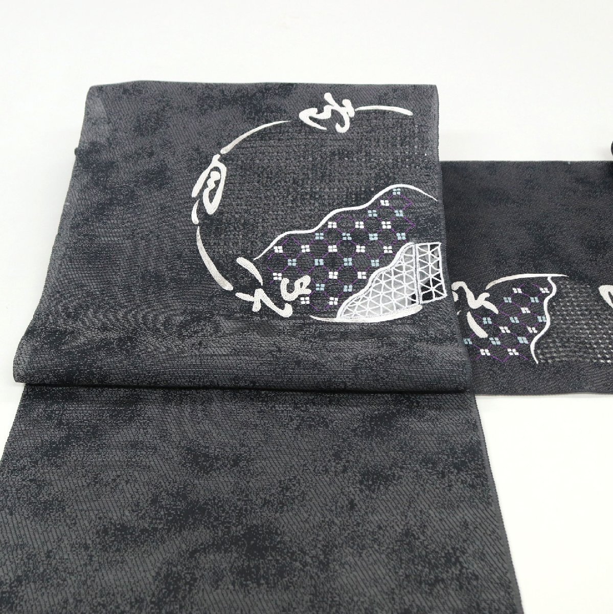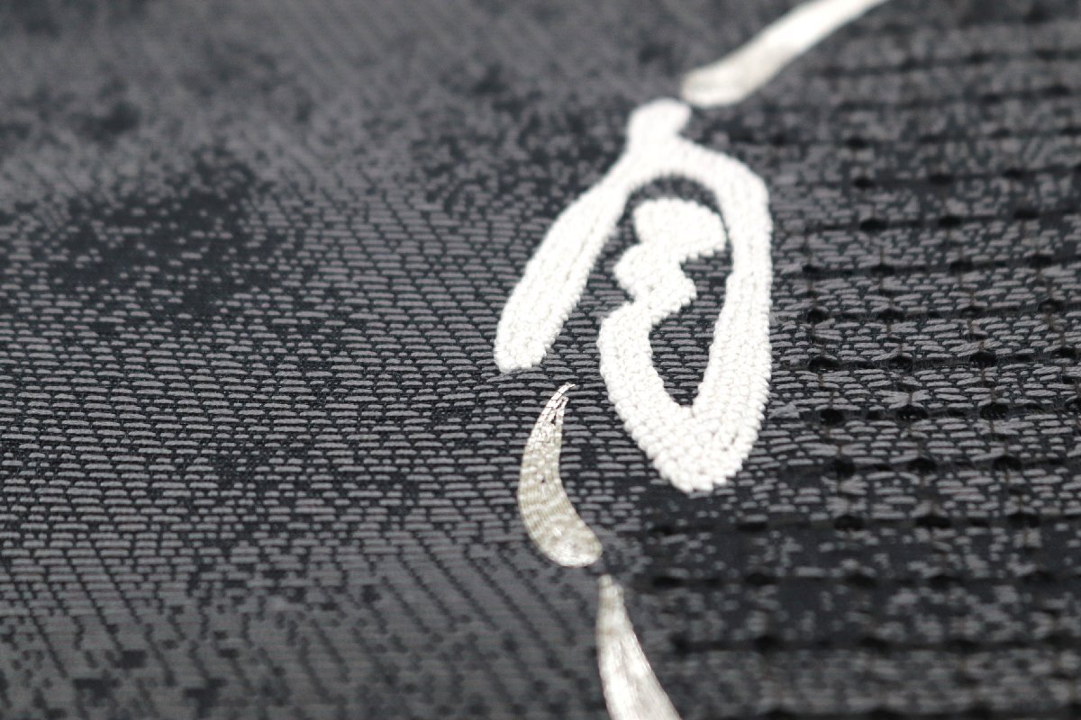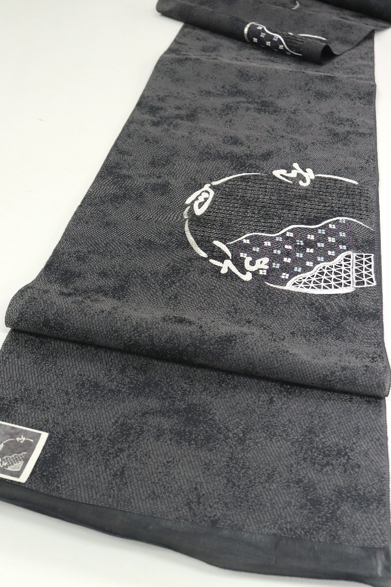 少し透け感のあるしなやかな帯地は、黒地に鼠色のお色目で斑模様が表現されております。