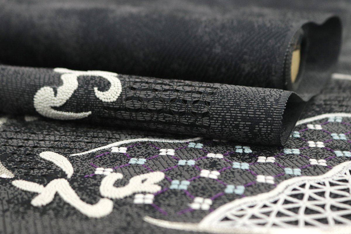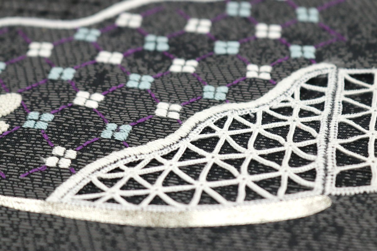 模様には粗めのレースのような刺繍が施されており、中の帯芯が透けるようになっております。