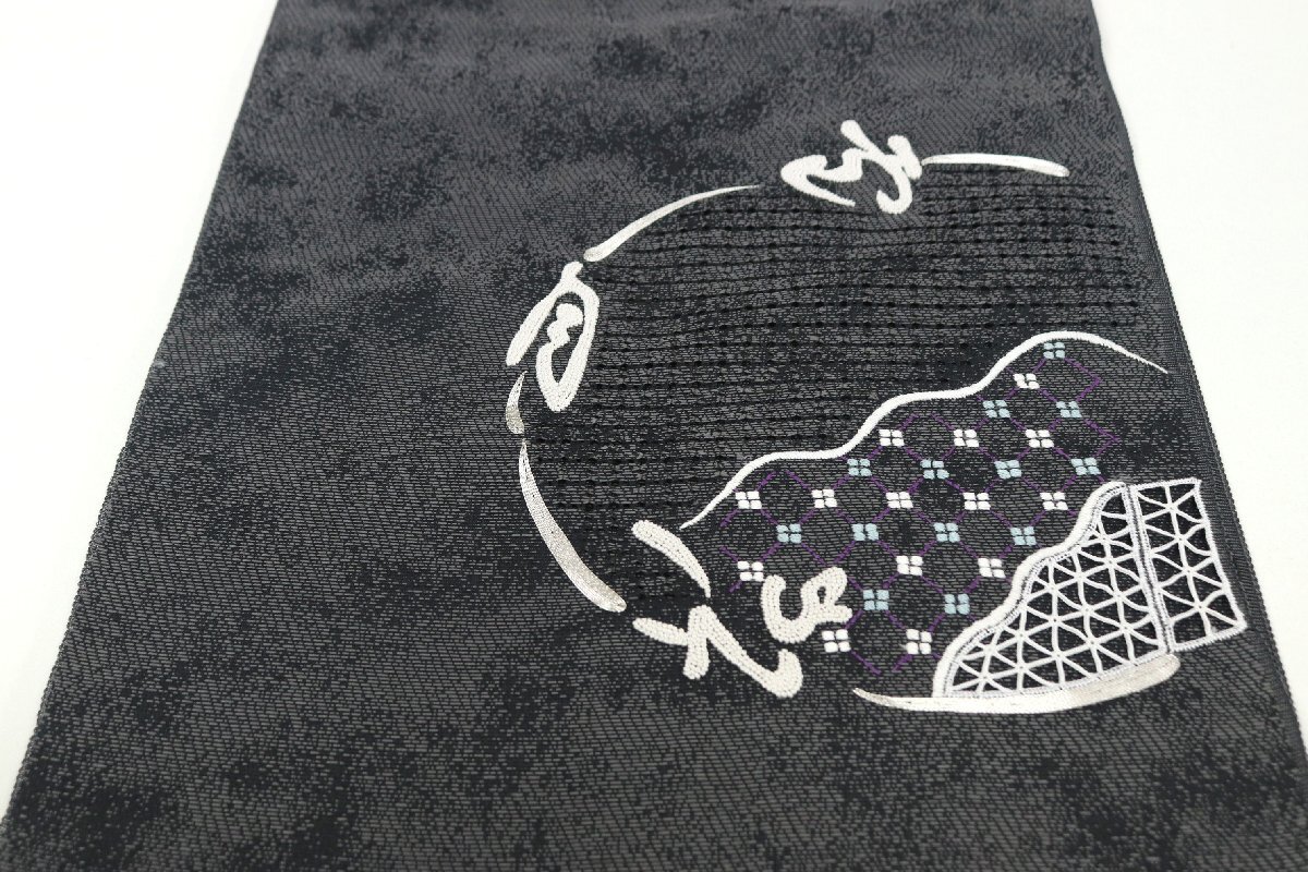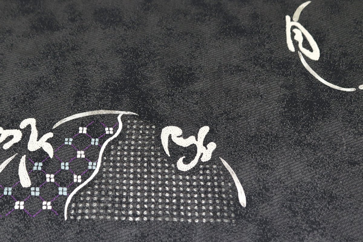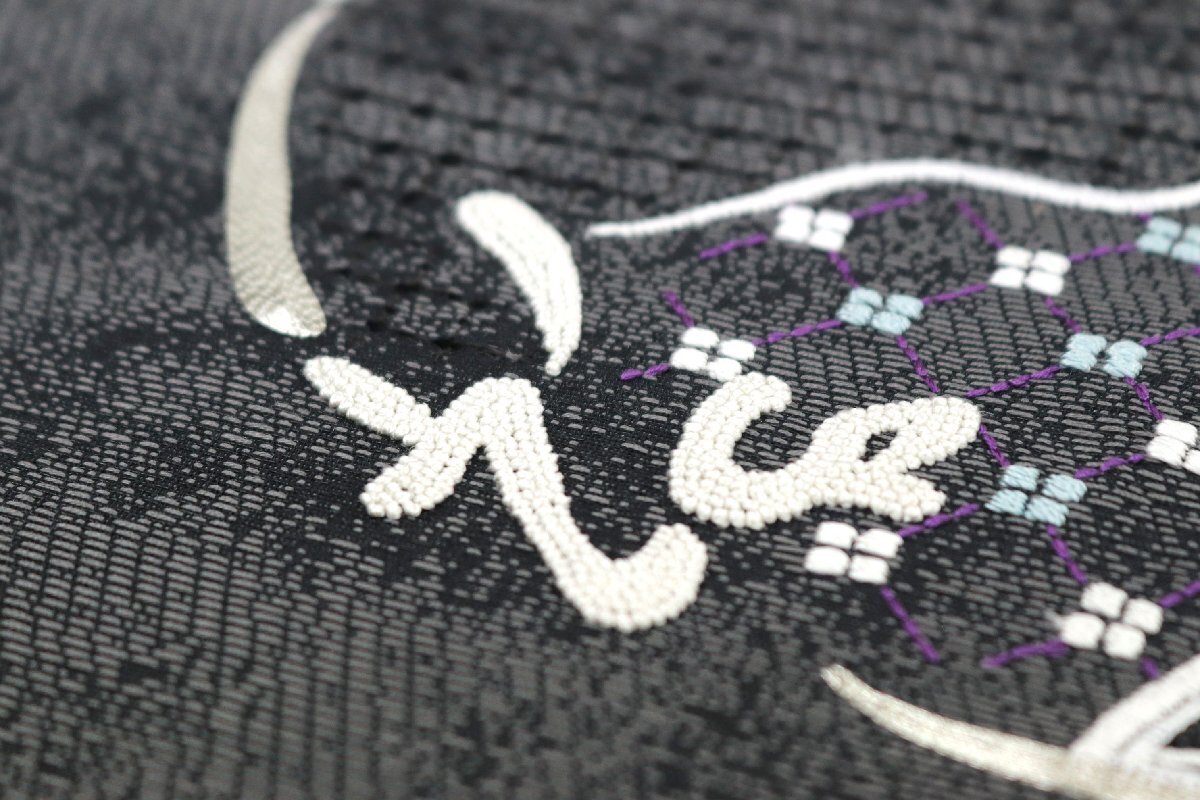 お太鼓や胴部分には白色、薄水色、青紫色、銀糸で雪月花の文字文と菱格子のような模様が刺繍されております。