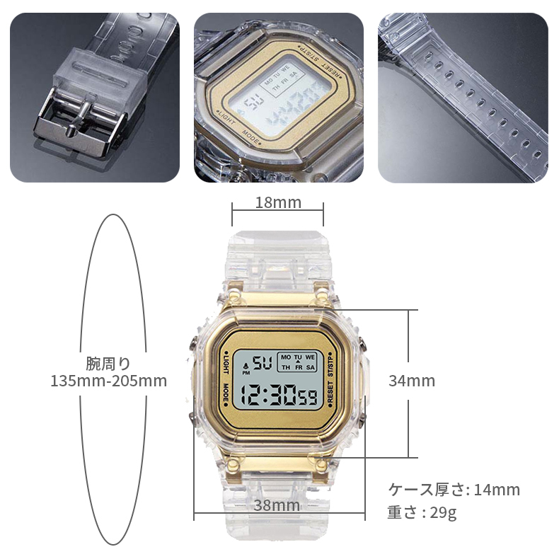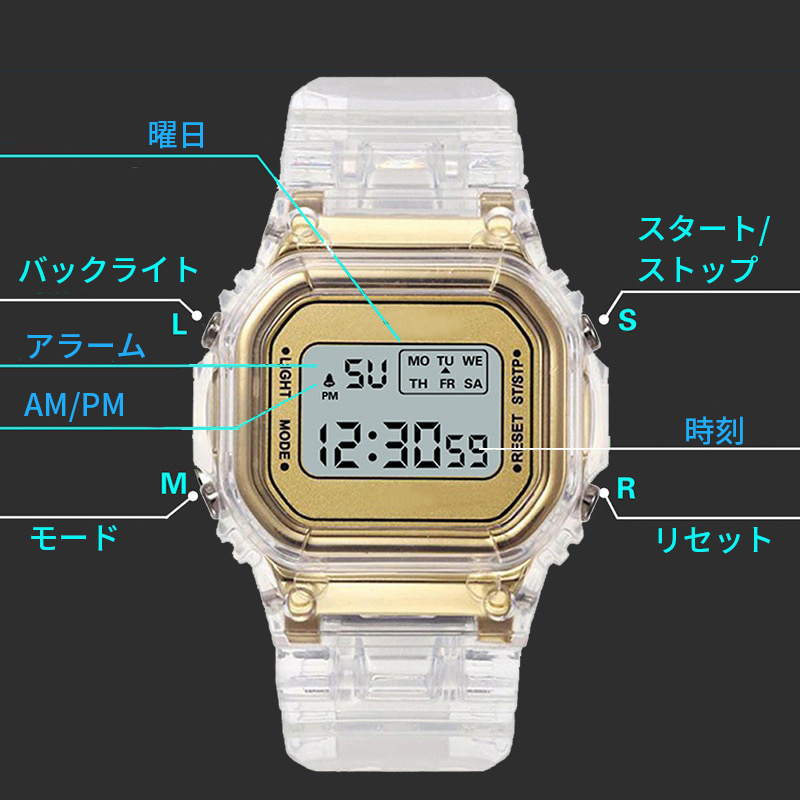 機能:時間表示(12時間/24時間表示)、日付表示、曜日表示、アラーム、ストップウォッチ、バックライト
