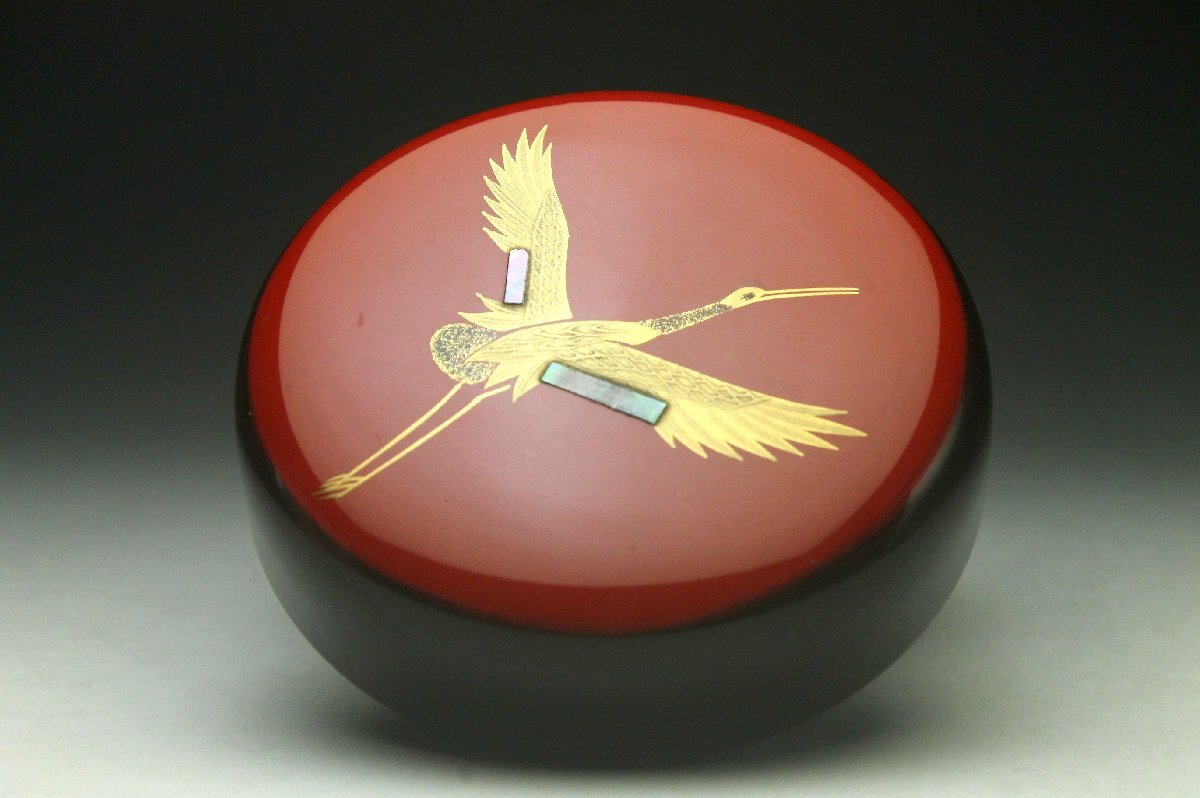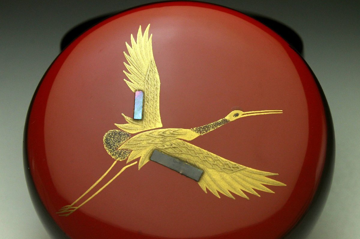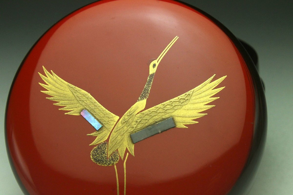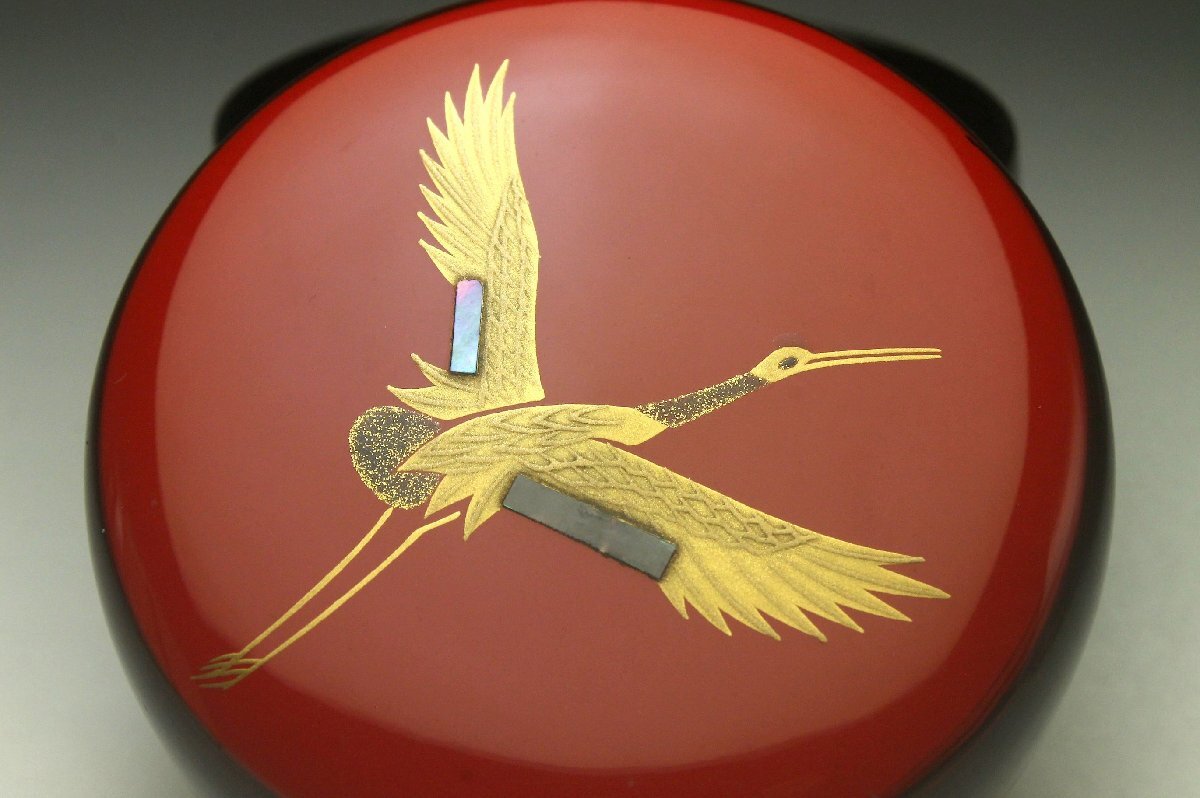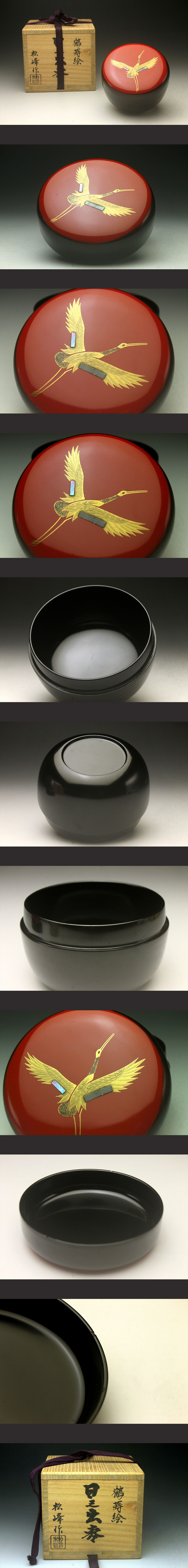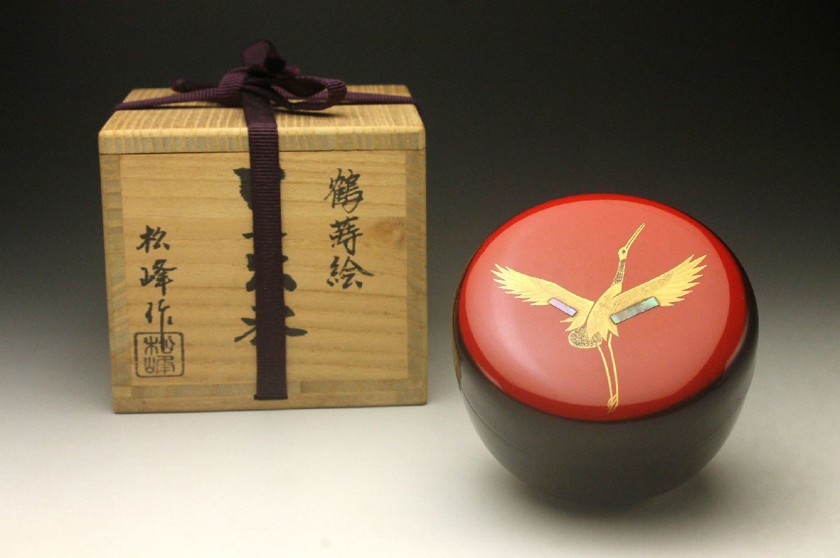 【余韻】 茶道具 蒔絵師 中出松峰 日之出 螺鈿細工 鶴蒔絵 棗★共箱 本物保証<同梱可>