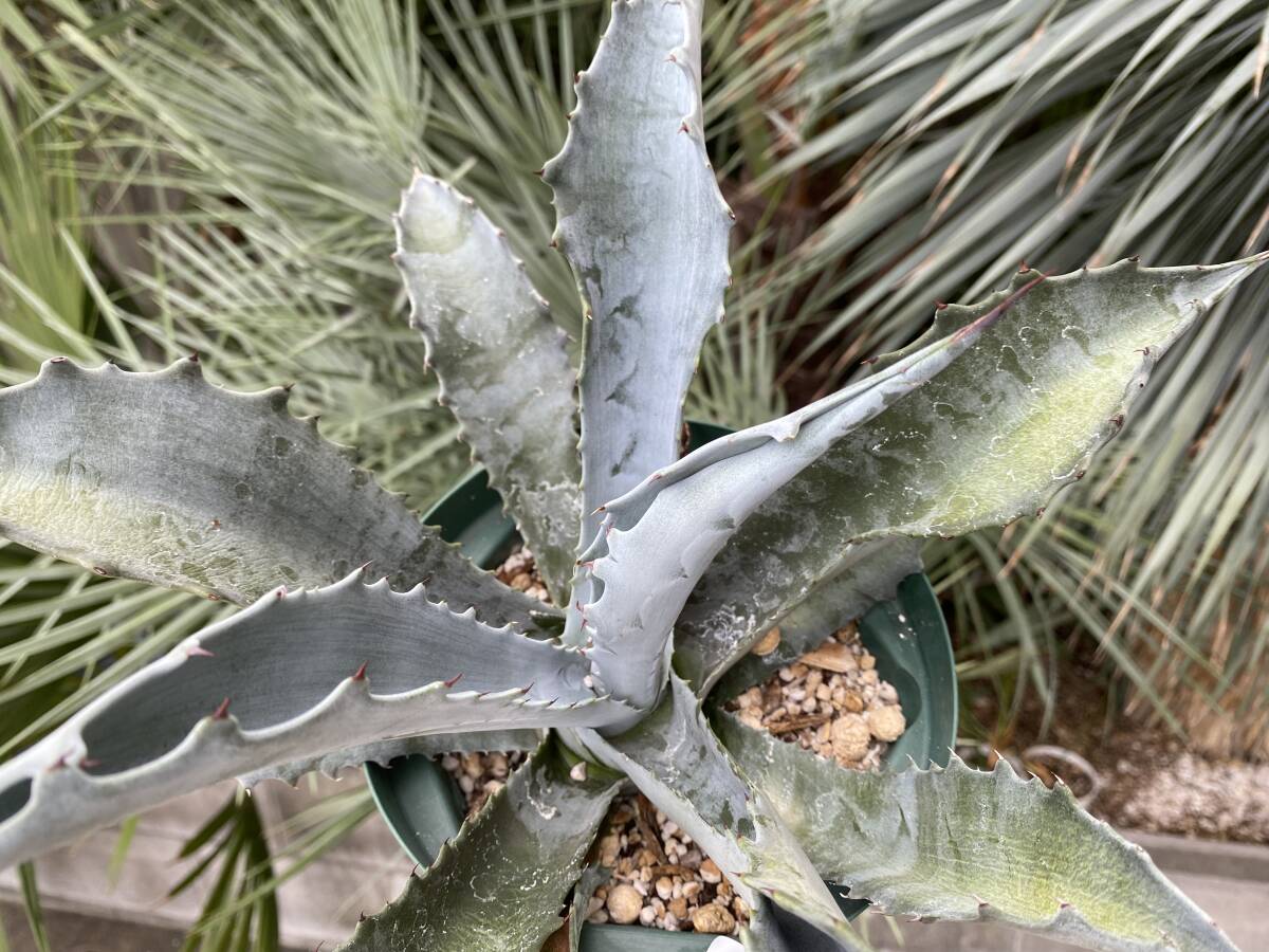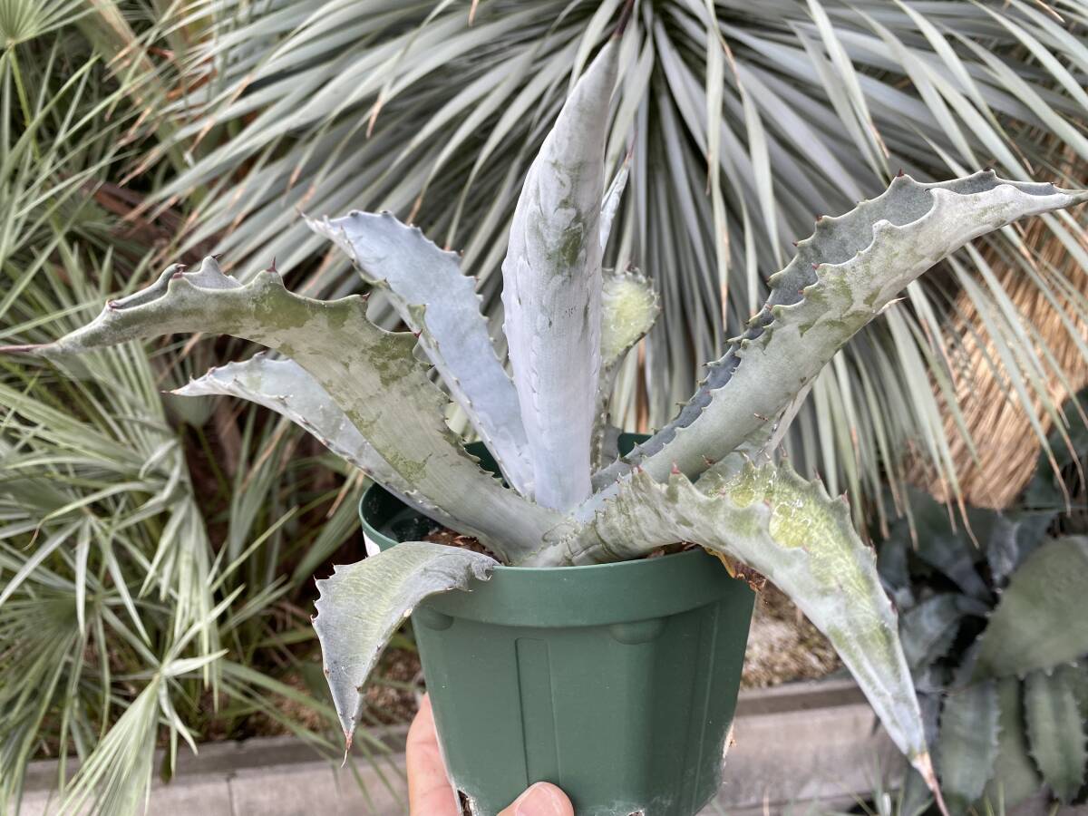 Agave americana var.protamericana 'Funky Toes'は、メキシコ北部の山で発見された品種で、Agave americanaとAgave asperrima(スカブラ)との間に偶発的に生まれた天然ハイブリッドです。非常に幅が広く白いウォーターマークある青緑色の葉をしており、成長と共に、それぞれの棘の間隔が広くねじれ曲がっていくのが特徴です。