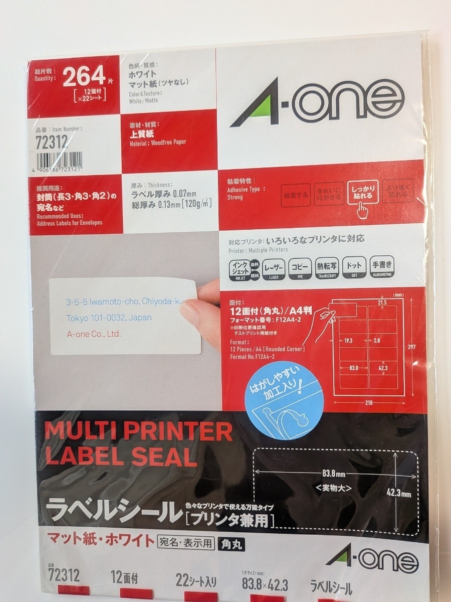 ・ 72312 プリンタ兼用 四辺余白付 角丸 A4 12面 22シート 上質紙 一片サイズ 83.8mm×42.3mm 角丸 しっかり貼れる 粘着タイプ(1,232円) 18シート