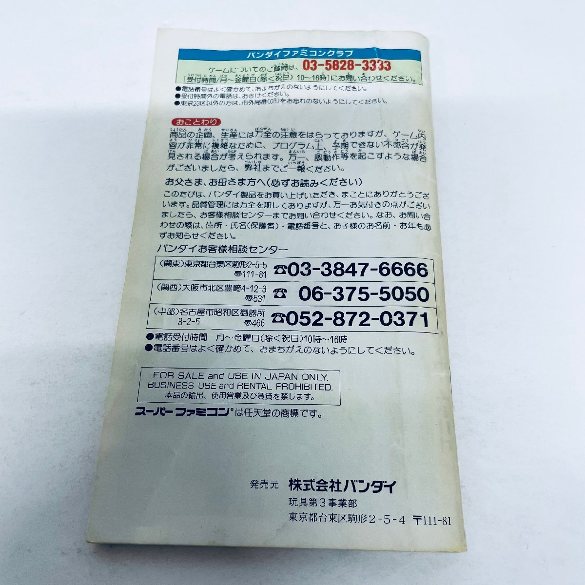 | *商品画像と説明に大きな相違がある場合のみ返品・返金などの対応を致します。 *お使いのモニタ・端末によって商品画像の色などが違って見える場合がございますご確認の上ご入札よろしくお願いいたします。 *ゲームの起動は確認済みですが、全てのプレイを行っておりませんので完璧な動作は保証できかねます。 *セーブの確認もしておりませんので、セーブ可能を前提のお客様はご購入をお控えください *商品のダメージをすべて確認できていない場合もありますので細かい状態が気になられる方はご入札をお控えください。 *古い商品ですので完品をお求めの方はご入札をお控えください。 *純正のスーパーファミコンで起動できても互換機では起動しないものもあります。純正のスーパーファミコンを使用したうえでの起動確認となっておりますので予めご確認お願い致します。 |