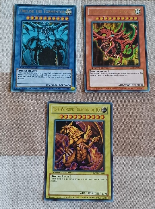 画像を確認の上判断下さい。(オベリスクの巨神兵、オシリスの天空竜)がやや傷や汚れ有りでラーの翼神竜は、目立った傷や汚れなしです。