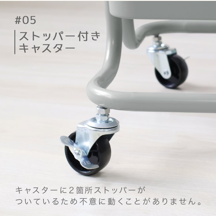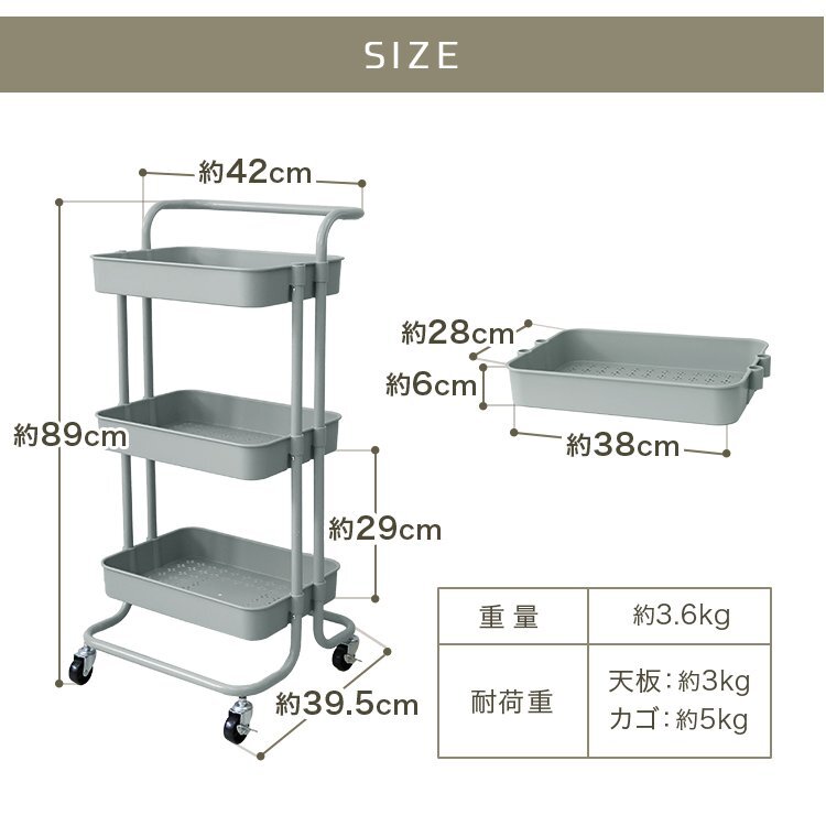 \お部屋に置くだけで絵になる収納ラック/ おしゃれなバスケットトローリーは、“見せる収納”としても大人気のアイテムです。 場所を選ばないシンプルでスタイリッシュなデザイン♪ 落ち着いたカラーで、インテリアになじみます。 ◆おすすめポイント◆ ・テーブルにもなる天板付き 天板を取り付けることで 作業台やサイドテーブルとして使うこともできます! ・取り外し可能なハンドル付き ハンドルがついているお陰で移動も便利に♪ 移動だけではなく、ハンドル部分にタオルもかけられます! 不要な時はすぐに取り外せる所がポイントです! ・小物入れ・フックが付属で付いてきます! 取り外せる小物入れが2つ、L字セットが4つ付いてきます♪ 物をかけたり入れたりできる便利アイテムです! ・通気性抜群なワゴンの底面 かわいい花柄のメッシュデザインを採用しており 通気性だけでなく見た目もオシャレにこだわりました! ポリプロピレン製なので、サビる心配もなく楽々お掃除できちゃいます! \使い方によって段階を調整できます/ 上段のトレーとパイプを外すことで2段としても使うことができます♪ 子ども用の収納ラックや、机下の収納用など幅広く活用できます! 【商品仕様】 ・カラー:グレー ・サイズ:(約)縦幅89cm×横幅42cm×奥行39.5cm ・重量:(約)3.6kg ・耐重量:天板(約)3kg/カゴ:(約)5kg ・材質:ポリプロピレン/炭素鋼/密度ボード 【注意事項】 ・パイプ同士を接合する際に指を挟まないよう注意してください。 ・付属のネジやナットは数が余る場合がございます。 ・設置した際にガタつく場合は、キャスターのナットの位置を変え高さを調整してください。 ・製造工程や輸送中に多少の傷などがある場合がございます。 こちらは返品対象となりませんので、予めご了承ください。 ・商品は、モニターによって色合いが異なって見える場合があります。 ・仕様・デザインは改良のため予告なく変更することがあります。 |