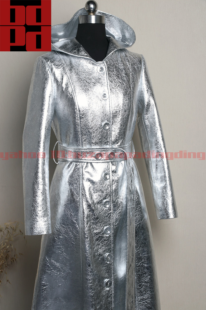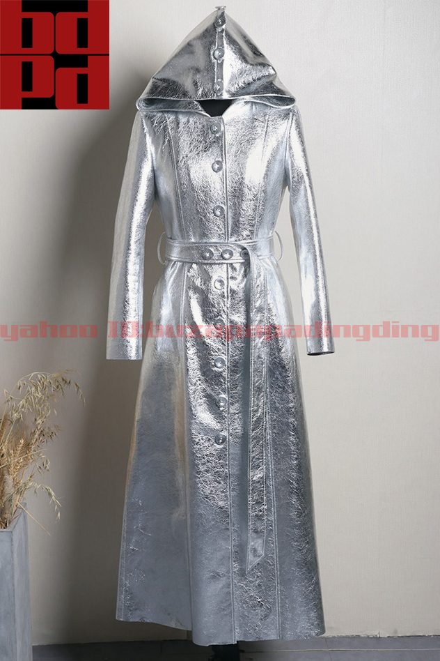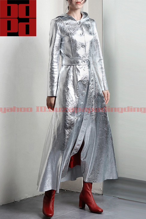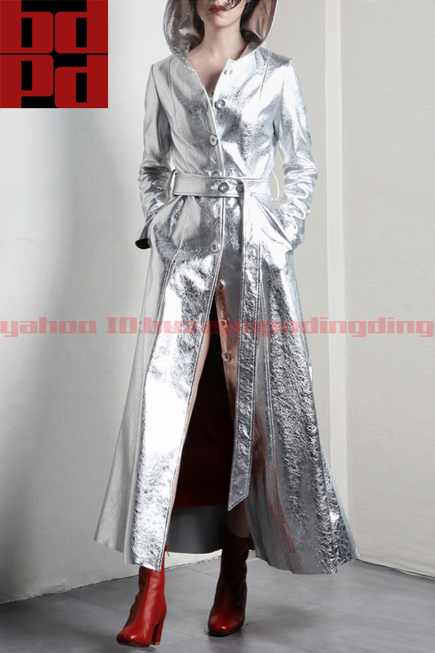 ラムレザー メタリックシルバー エクスプロージョン柄 フード ロングコート レディース レザーコート ストリート サイバー 注目度抜群 Z47