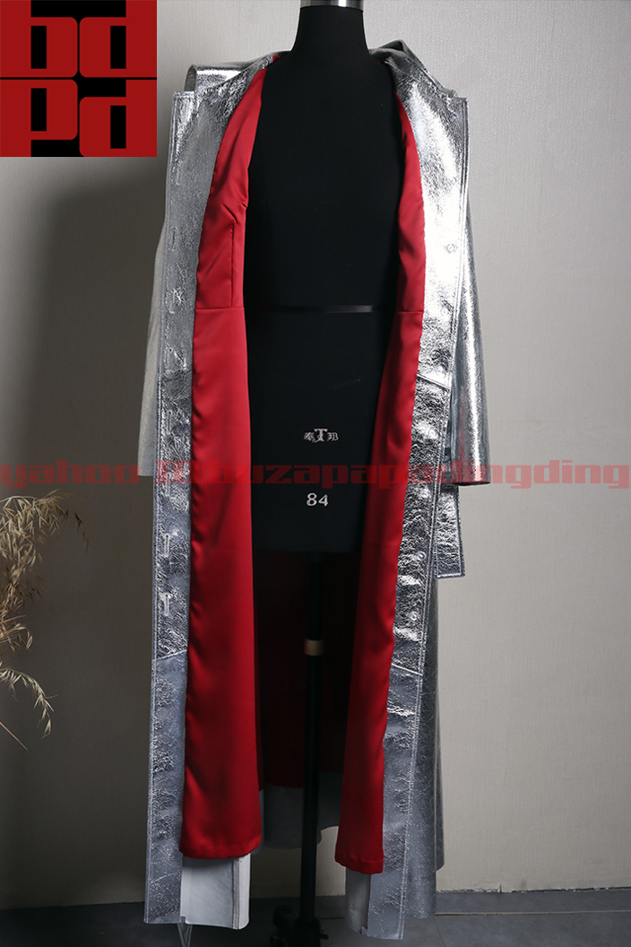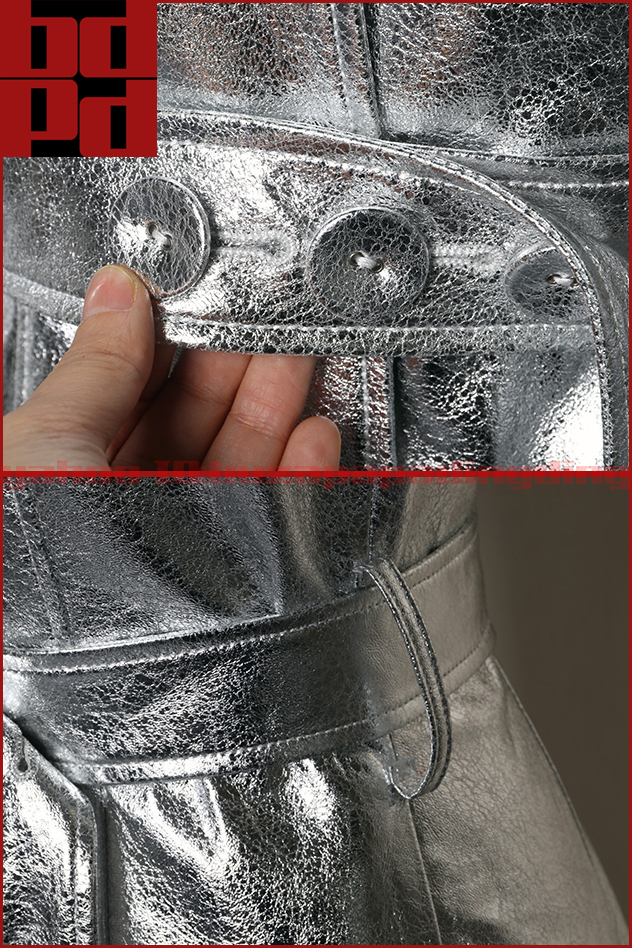 輸入ラムレザーを使用した、メタリックなシルバーカラーと大胆なエクスプロージョン柄が特徴的なフード付きロングコート。ストリートで圧倒的な存在感を放つ、未来的でクールな一品です。