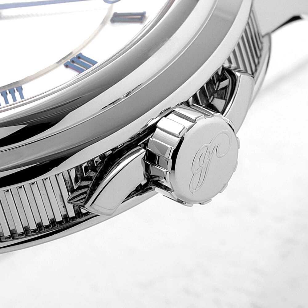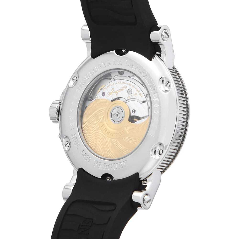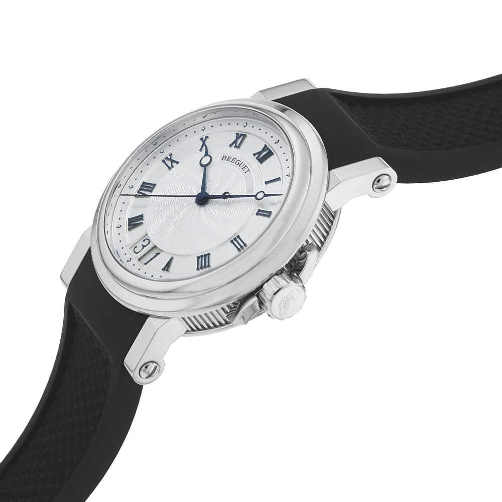 モデル情報 | 創業者であるアブラアン-ルイ・ブレゲにより、フランス海軍のマリンクロノメーターにヒントを得て誕生した"マリーン"ウォッチ。手彫りのギョーシェダイアルにコインエッジなど伝統的なデザインを継承しつつも、大きめで厚みのあるケースを採用するなど、現代によくマッチしたテイストを取り入れることにより、モダンで若々しい印象に仕上がっています。シルバーにブルーの針とインデックスは爽快感あるイメージです。パワーリザーブ65時間。100m防水。 |