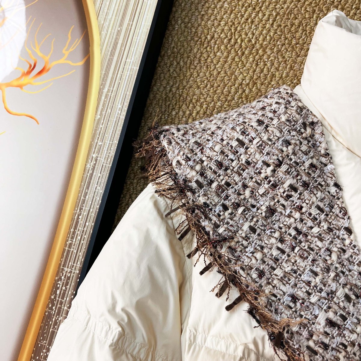 首元までしっかり覆うハイネックデザインで、防寒性抜群。クラシックな総柄があしらわれたショール風の襟がアクセントとなり、上品で華やかな印象を演出します。コンパクトなショート丈で、脚長効果もいいです。両サイドにポケット付きで、ちょっとした小物収納にも便利です。