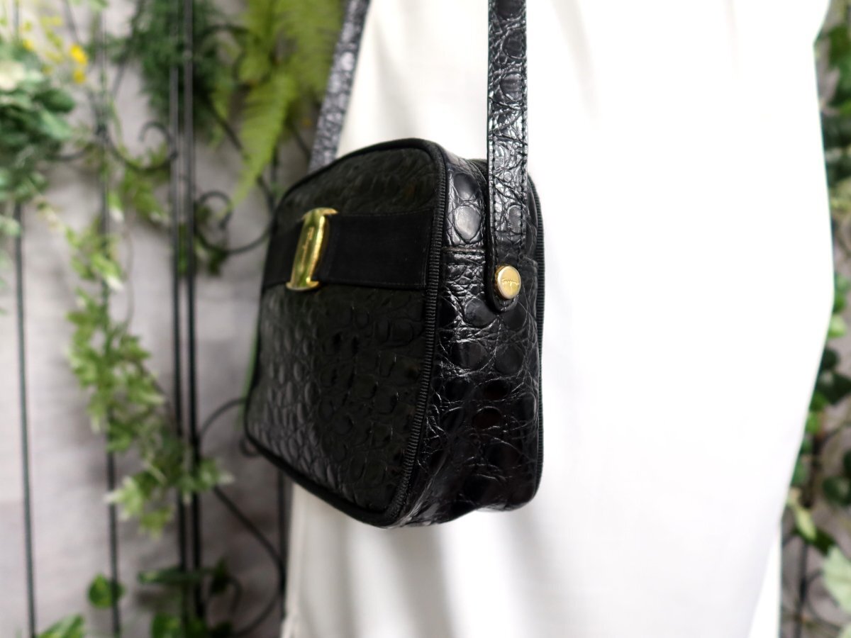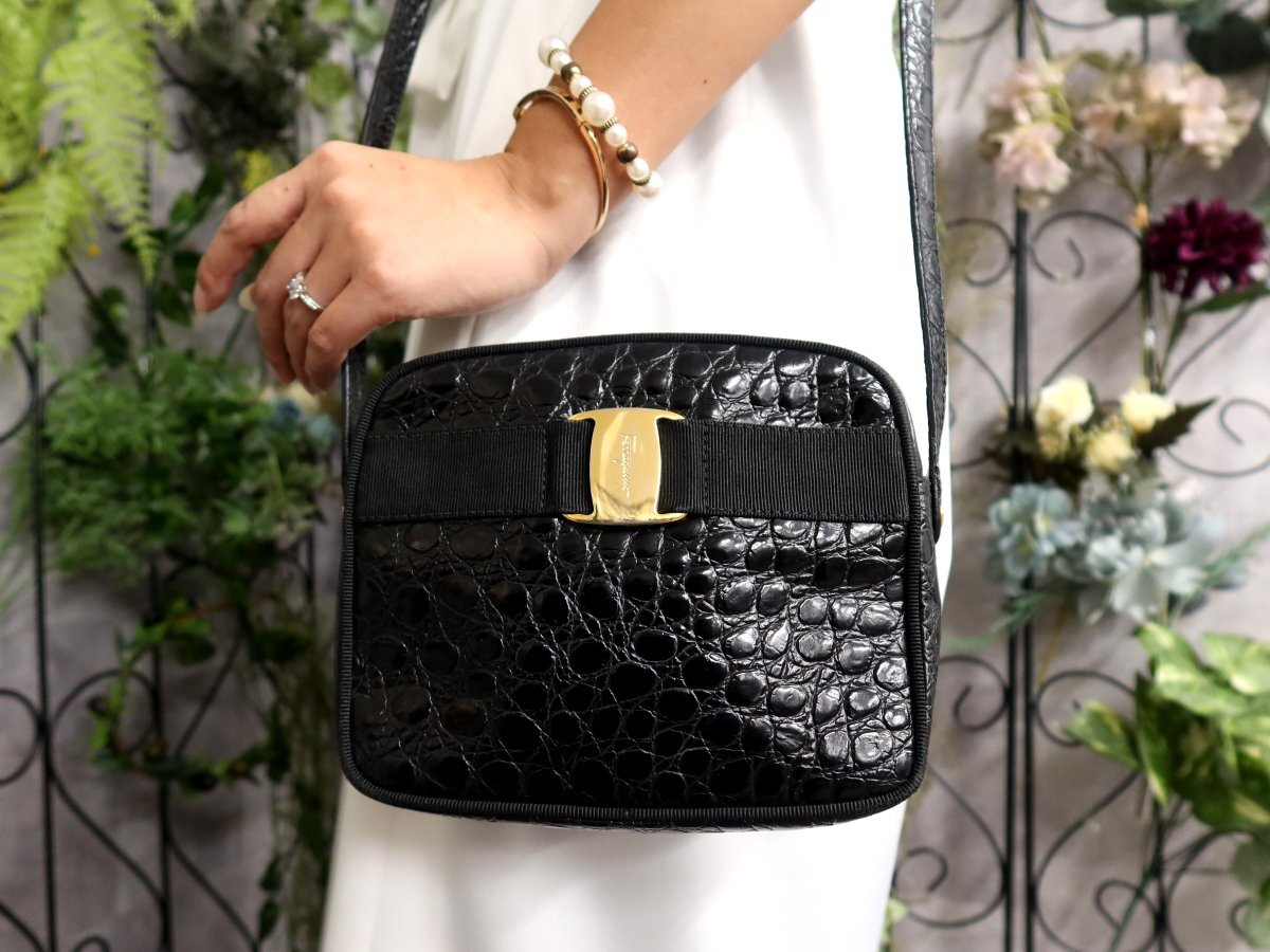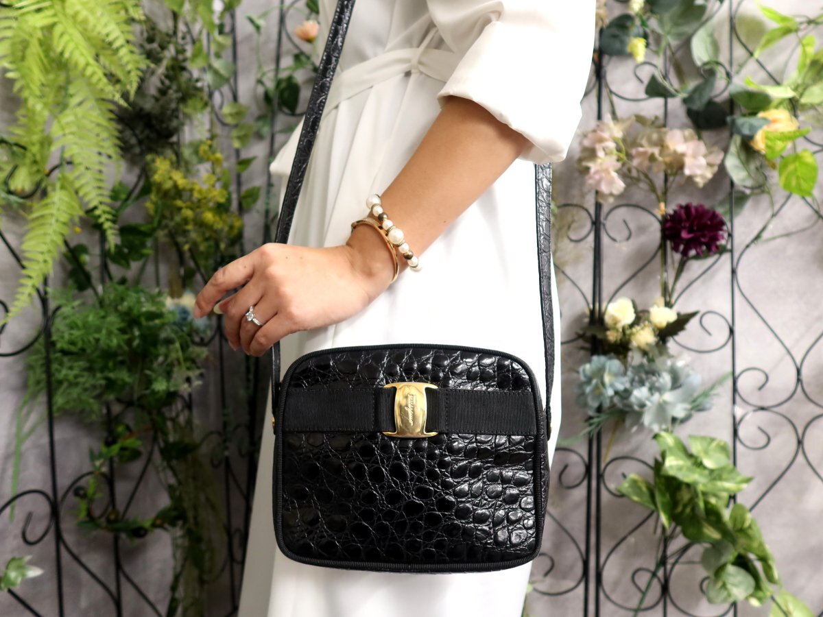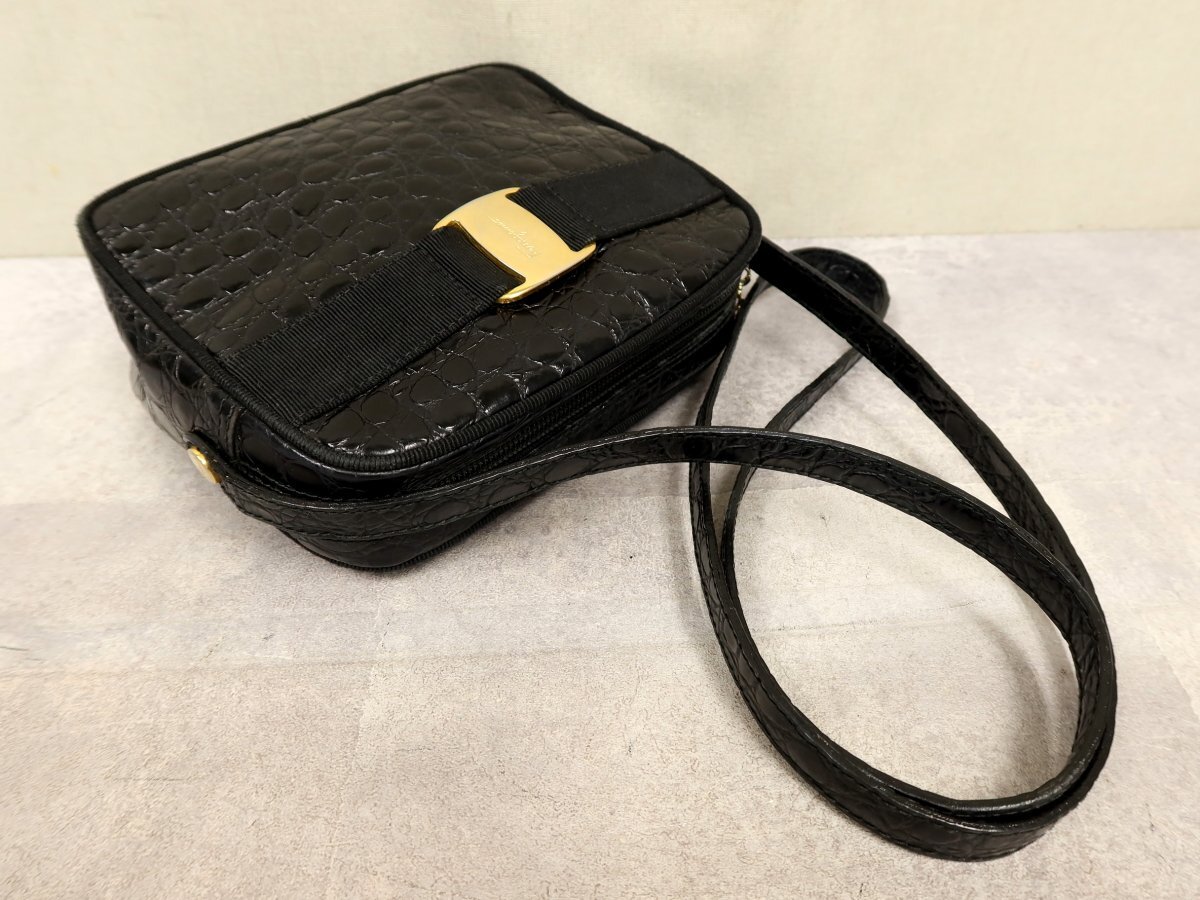 ●超美品●Salvatore Ferragamo フェラガモ●ヴァラ●クロコダイル 型押し レザー 本革●ショルダー バッグ●黒●ゴールド金具●Js60913