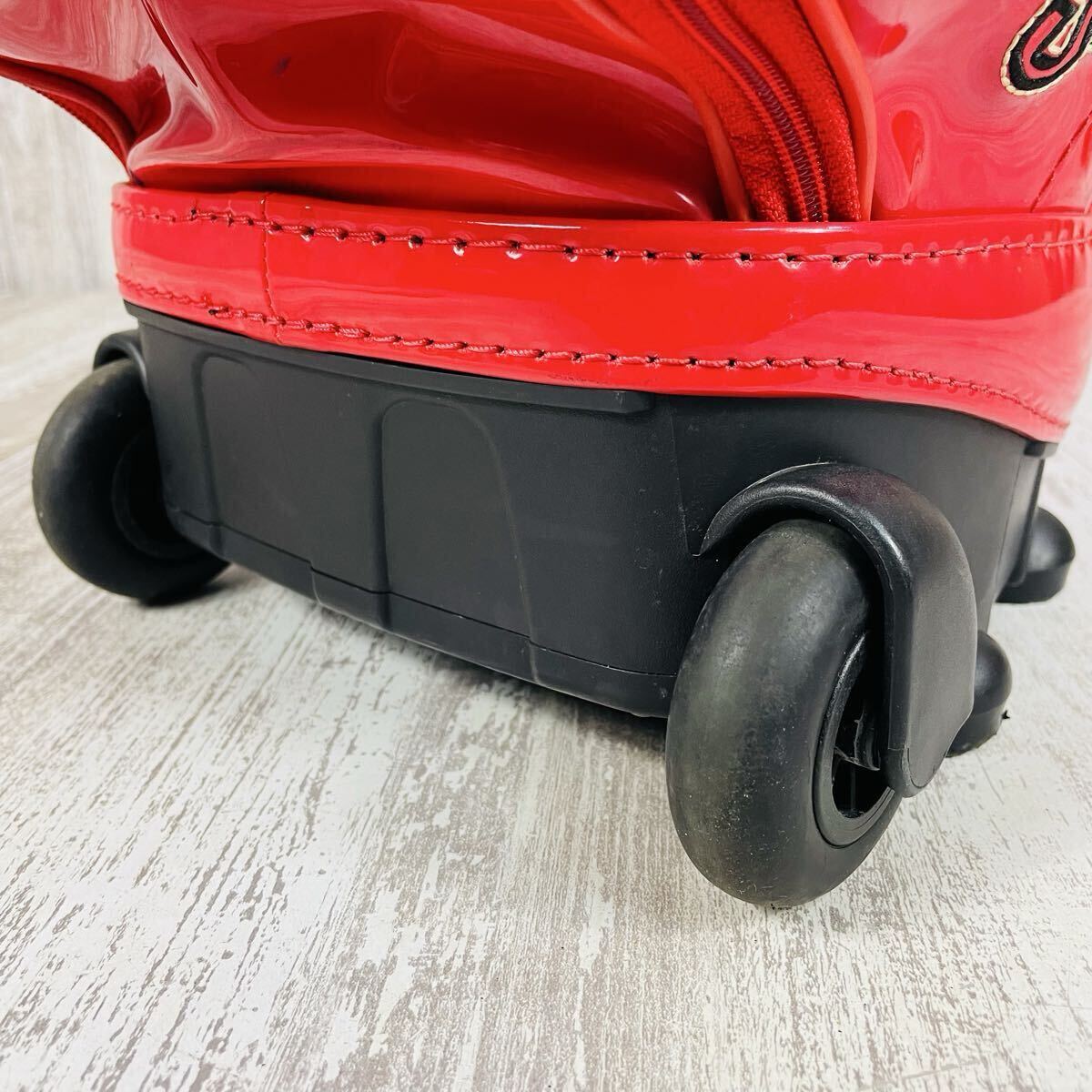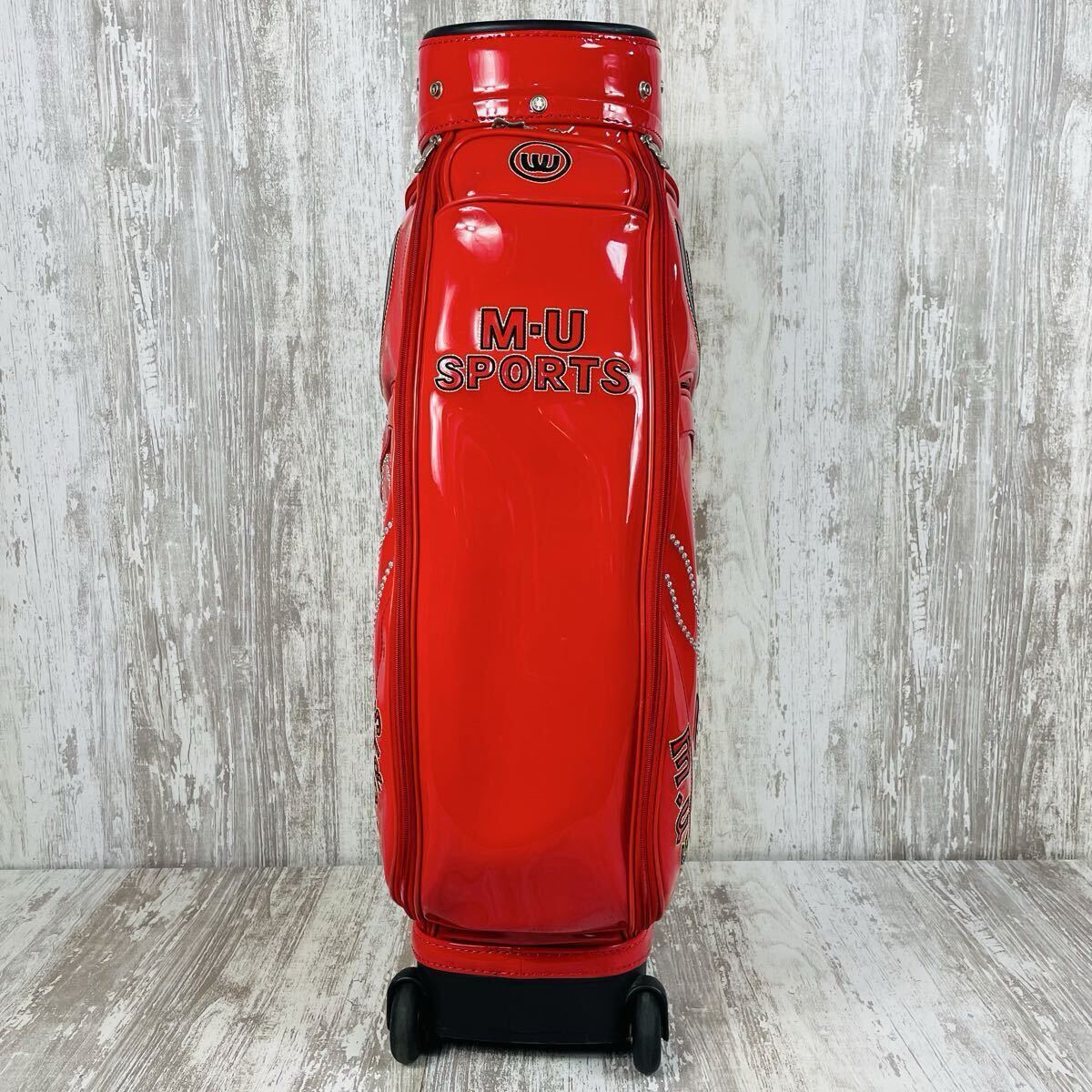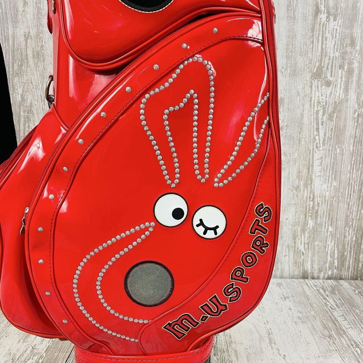 M・U SPORTSのキャディバッグです。鮮やかなレッドカラーにウサギのキャラクターがデザインされており、とても可愛らしいです。カートに載せて移動しやすいキャスターと伸縮するハンドルが付いています。