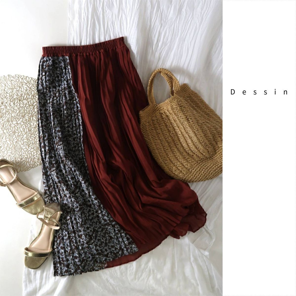 デッサン Dessin/アンタイトル☆洗える【ウエストゴム】線画フラワー切替プリーツスカート 1サイズ☆A-O 3328