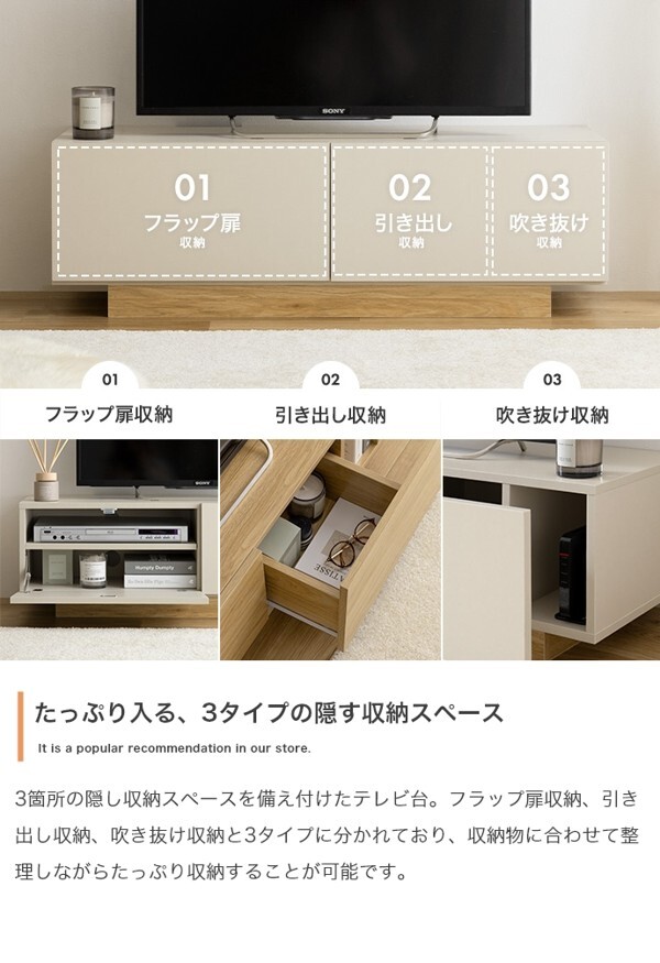 ※現在ご覧の商品ページはナチュラルのご購入ページとなります。 ヤフオクの仕様上単一ページに複数バリエーションを掲載することができませんので、他バリエーションが希望の場合は別ページでご購入お願い致します。 バイカラーの配色が特徴的な『Pom』引き出し付きテレビ台。 ノイズレスでフロート脚のデザインは、置くだけでアクセントとなり、洗練された空間へと導きます。 また引き出し収納や扉収納、吹き抜け収納を設置し、大容量収納ができるのでテレビ周りもすっきり。 さらに壁付けで配置できるのに配線もすっきり通すことのできる設計に仕上げました。 シンプルなのにこだわりの詰まったデザインと実用性を兼ねそろえたテレビ台です。 配達業者を指定いただくことはできません。 沖縄・離島に関しましては、別途配送料が必要となります。 北海道への配送も別途配送料が必要になる場合がございます。 ※別途送料が発生する場合は後ほどご連絡させていただきます。 タイミングによっては在庫切れの場合があります。