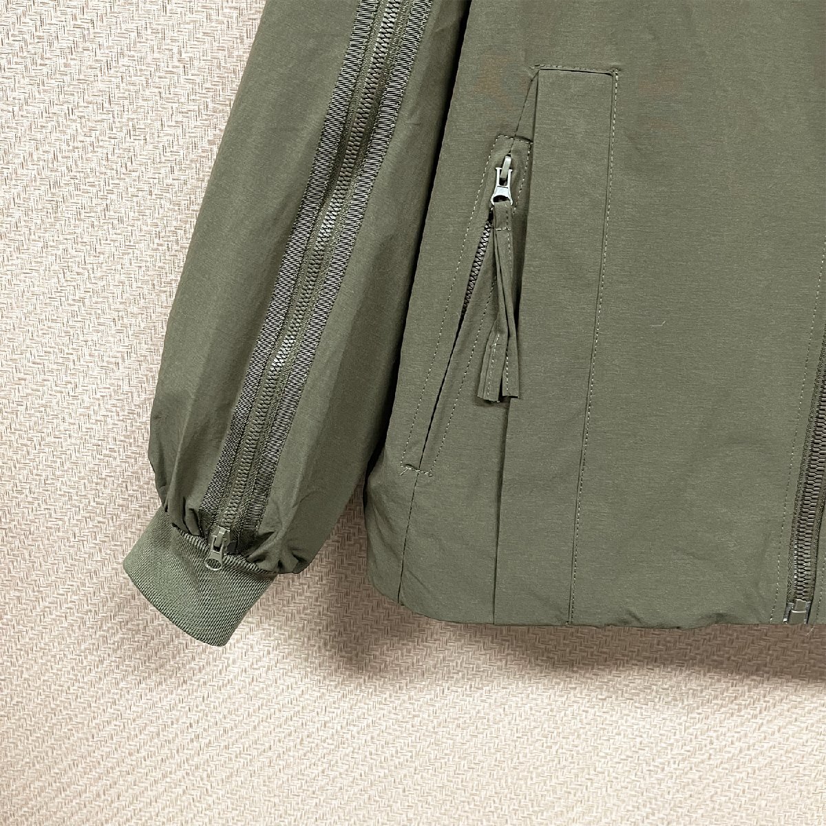 両袖にはジッパーが施されており、ジップを開けると内側のメッシュが現れ、ユニークかつスタイリッシュな印象を演出します。ファスナーを上まで閉じればハイネックに。首元までしっかりカバーし、防風性も抜群。両サイドポケットジッパーが付き、小物と貴重品を収納できて、便利で安全性も高いです。