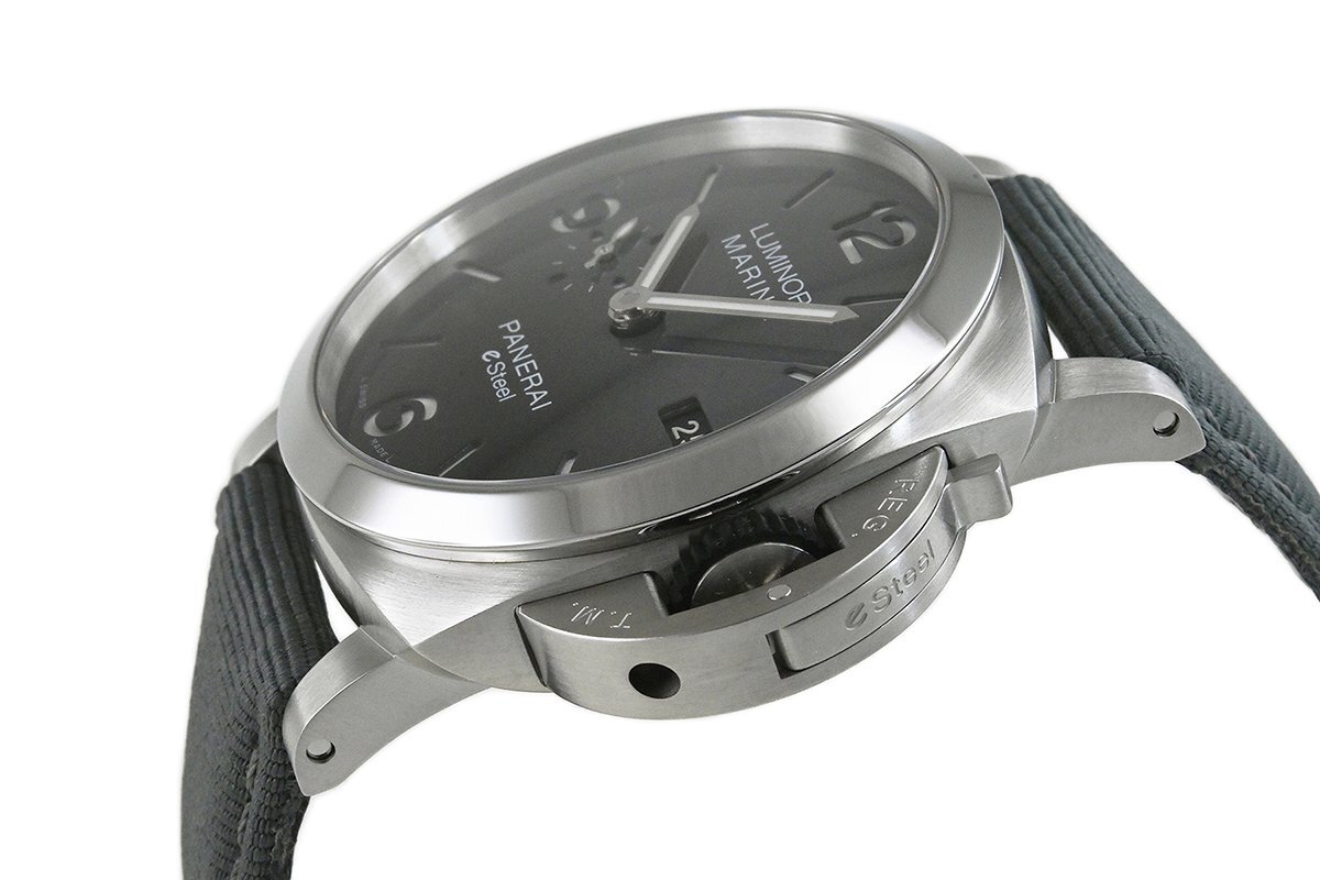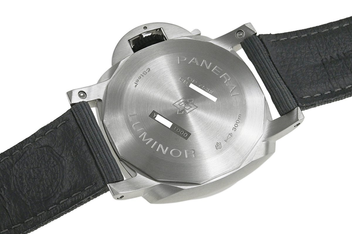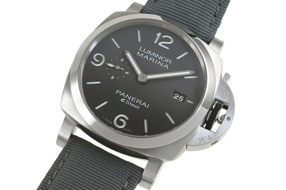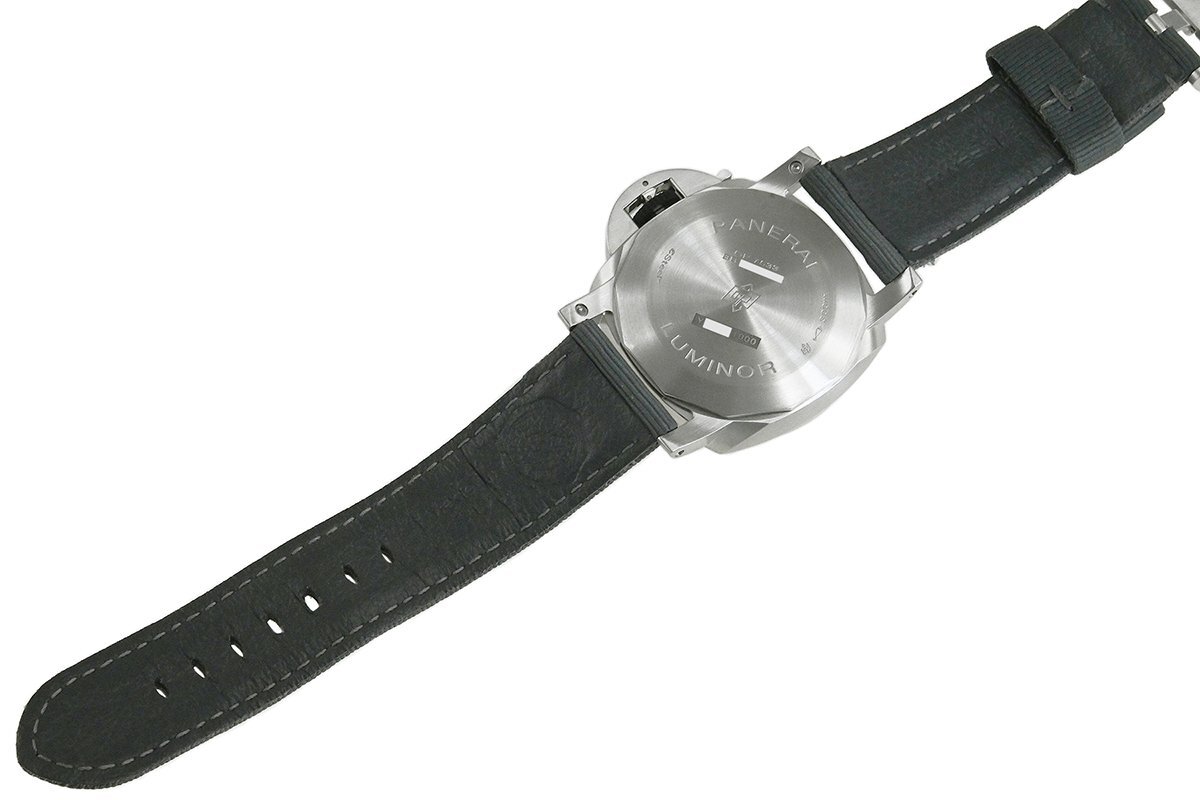 【コメント】 力強いケースデザインで人気の「ルミノール」シリーズ。サステナビリティ目標の重要性に配慮した先端素材のeSteelを使用したモデルです。グラデーションダイアルが特徴的、3日間のパワーリザーブをもつパネライ自動巻メカニカルP.9010キャリバーを搭載しています。少々の軽い擦りキズはありますが目立つ様な深いキズはありません。ベルトは巻き癖や尾錠の留め痕はありますが目立つ汚れ等なく良い状態です。2023年12月に国内正規店にて購入品で、オーバーホール歴は分かりませんが、現在精度は平置きで日差-1秒程です。