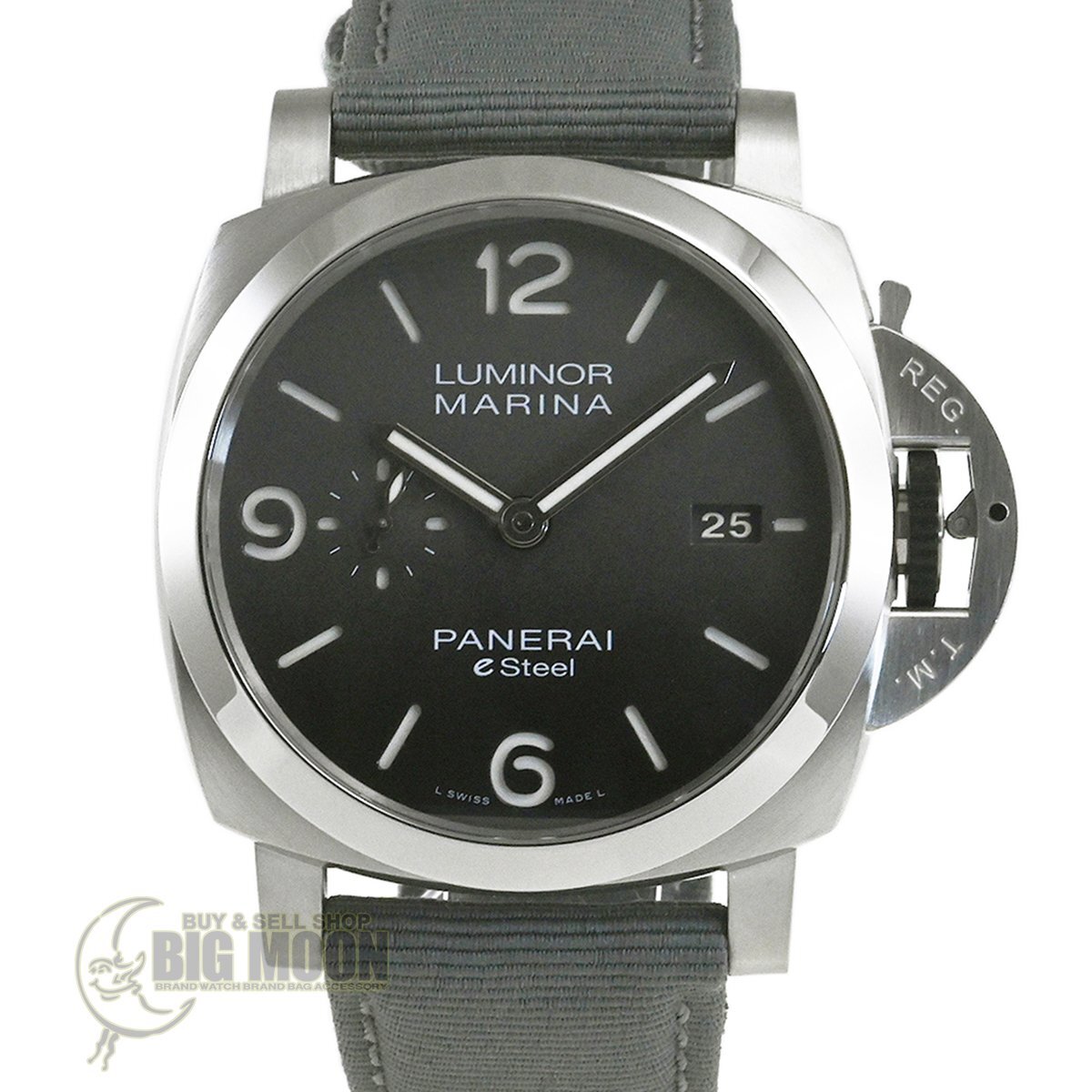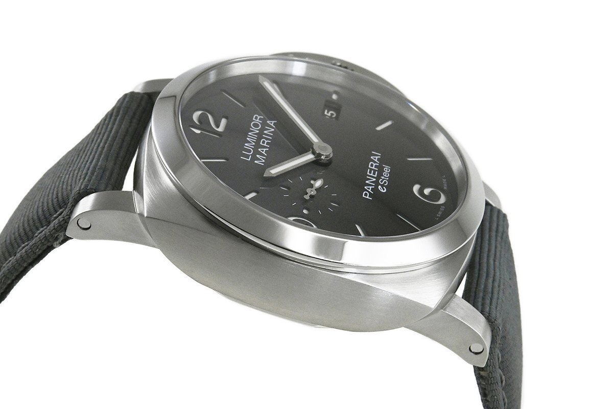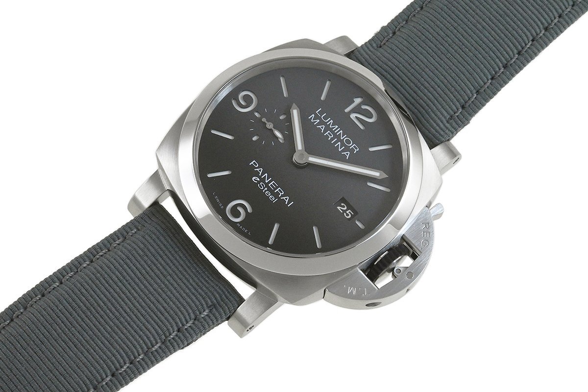 【コメント】 力強いケースデザインで人気の「ルミノール」シリーズ。サステナビリティ目標の重要性に配慮した先端素材のeSteelを使用したモデルです。グラデーションダイアルが特徴的、3日間のパワーリザーブをもつパネライ自動巻メカニカルP.9010キャリバーを搭載しています。少々の軽い擦りキズはありますが目立つ様な深いキズはありません。ベルトは巻き癖や尾錠の留め痕はありますが目立つ汚れ等なく良い状態です。2023年12月に国内正規店にて購入品で、オーバーホール歴は分かりませんが、現在精度は平置きで日差-1秒程です。